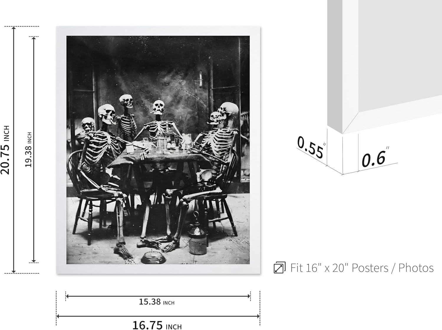 Poster Master Vintage Photograph Poster - Retro Daguerreotype Print - Gift for Artist, Friend - Skeletons Smoking at Table, Dinner Party, Goth - Wall Decor for Home, Dorm, 16x20 White Framed