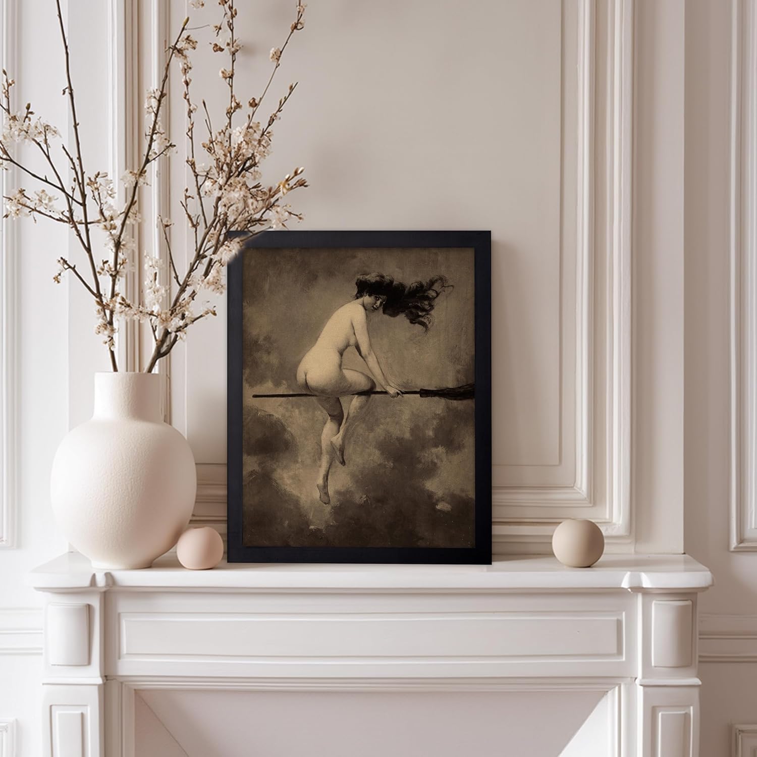 Poster Master Vintage Albert Joseph Penot Poster - Retro Halloween Print - Gift for Artist, Friend - Departure for the Sabbath, Naked Witch on Broom - Wall Decor for Bedroom, 8x10 Black Framed