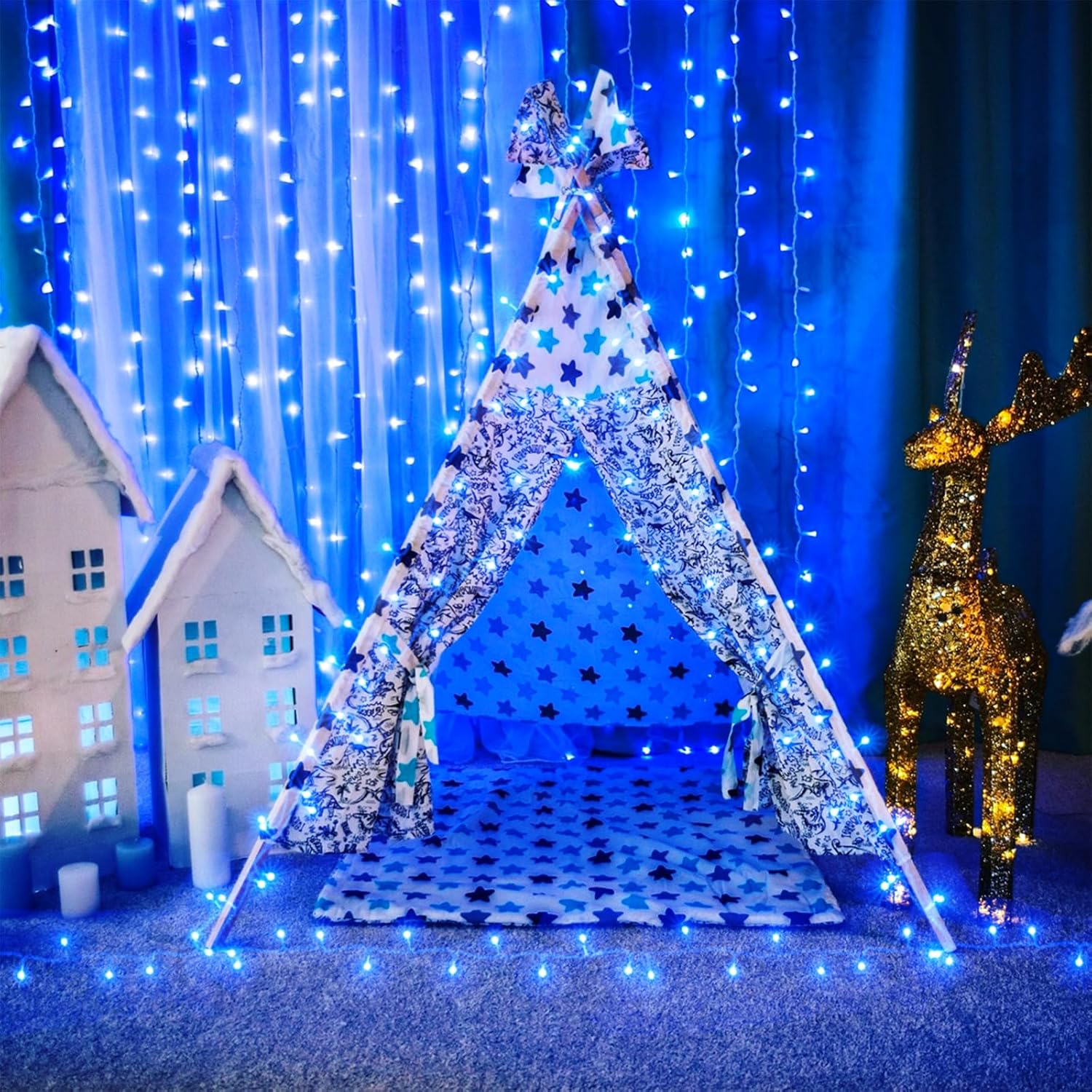 - Waterproof Fairy Lights Plug in: The blue Christmas lights design with IP44 outdoor waterproof, can withstand wind, snow, rain and extreme weather. String lights are equipped with a UL certified 29V low-voltage plug ensures the safety. It's safe for family with kids or pets!