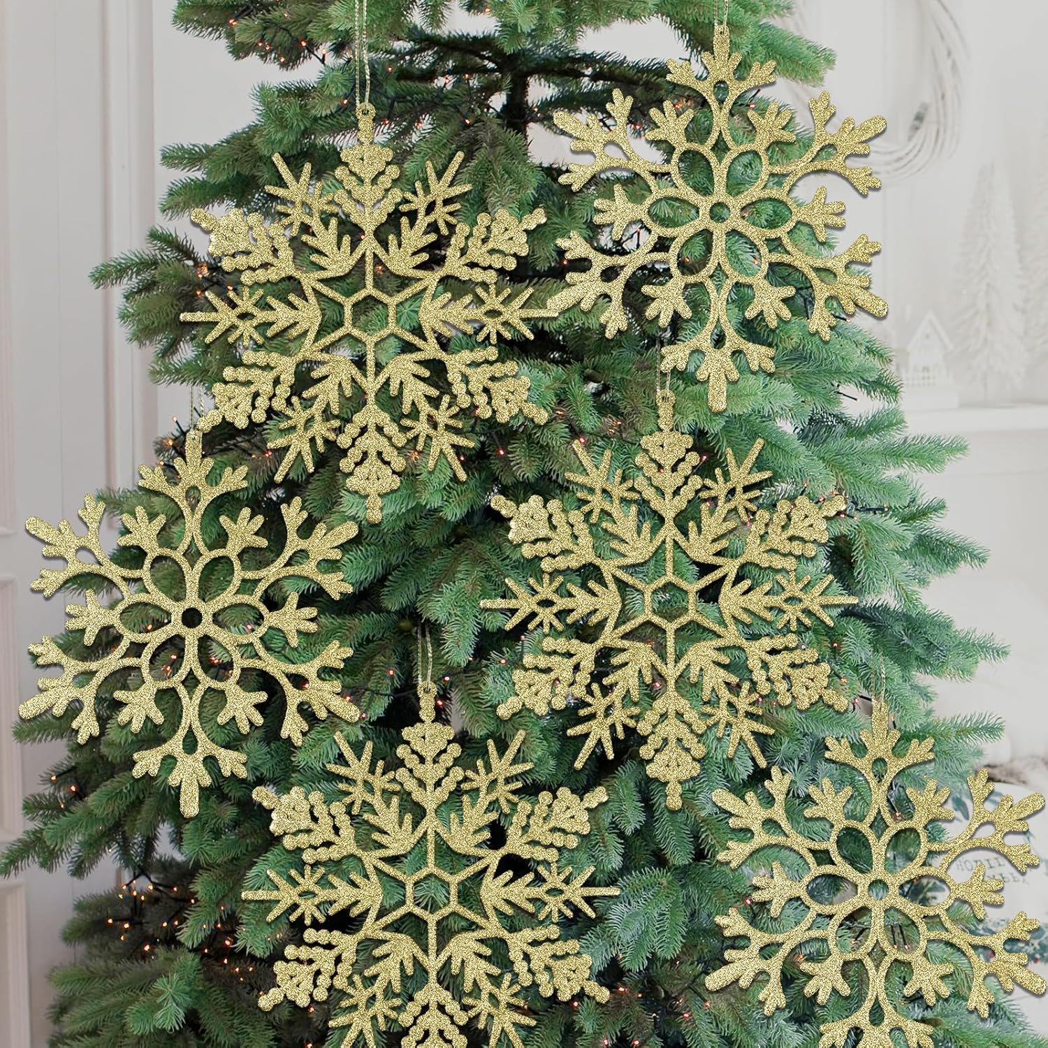 - SNOWFLAKES FOR CHRISTMAS: Featuring sparkly glitters on the surface, these gold glitter snowflakes tree ornaments add much more sparkle to your Christmas tree decorations, they also look gorgeous on windows, ceiling, fireplace, outside yard, porch etc, perfect winter decorations snowflakes; Besides, they are excellent for frozen theme birthday party, winter wonderland birthday party decorations.