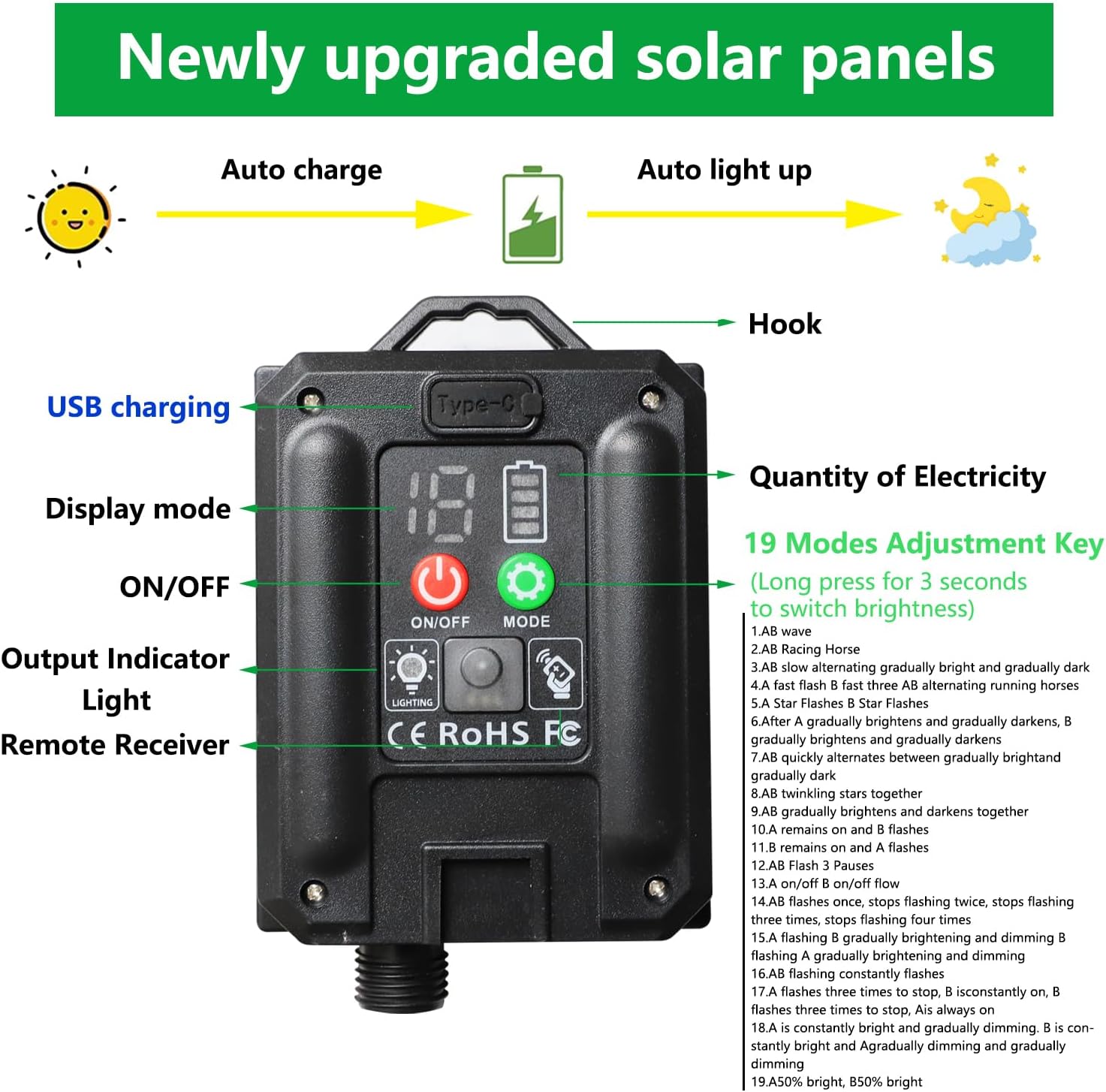 - 2.String Lights with Remote Control - Point the remote to the string lights, you can control the lights ON, OFF and lighting modes. And there are 19 different modes can be controlled by the button on the battery box.