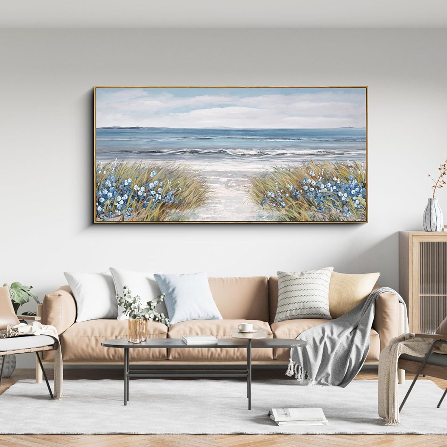 XLSJERST Framed Wall Art for Living Room Decor - Farmhouse Boho Beach Coastal Vintage Floral Ocean Wall Picture Flowers Sea Canvas Print Seascape Artwork for Home Living Room Bedroom Office 24x48