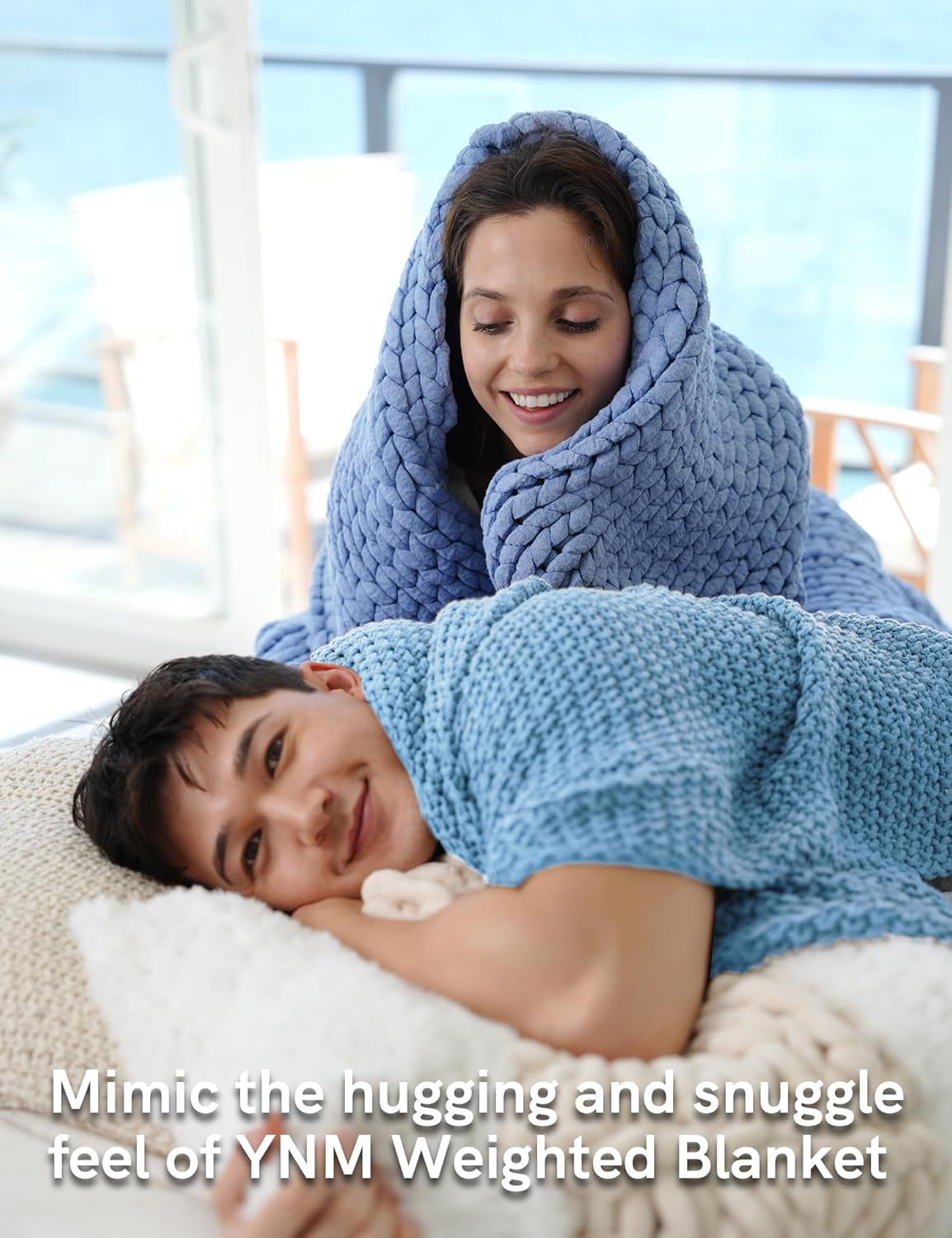 - [Style Meets Function] In order to mimic the hugging and snuggle feel of YNM Weighted Blanket, medium weight chunky yarn is chosen to hand knit this thick blanket(50x60 weighs 4.4lb, 60x80 weighs 7.3lb, 80x87 weighs 10.5lb). This thick chunky yarn not only provide soothing and relaxation feel, but also add texture to your blanket. Wrap around you on the sofa, layer the chunky knit blanket under your duvet or quilt to add warmth, or drape across your bed as a textural throw.