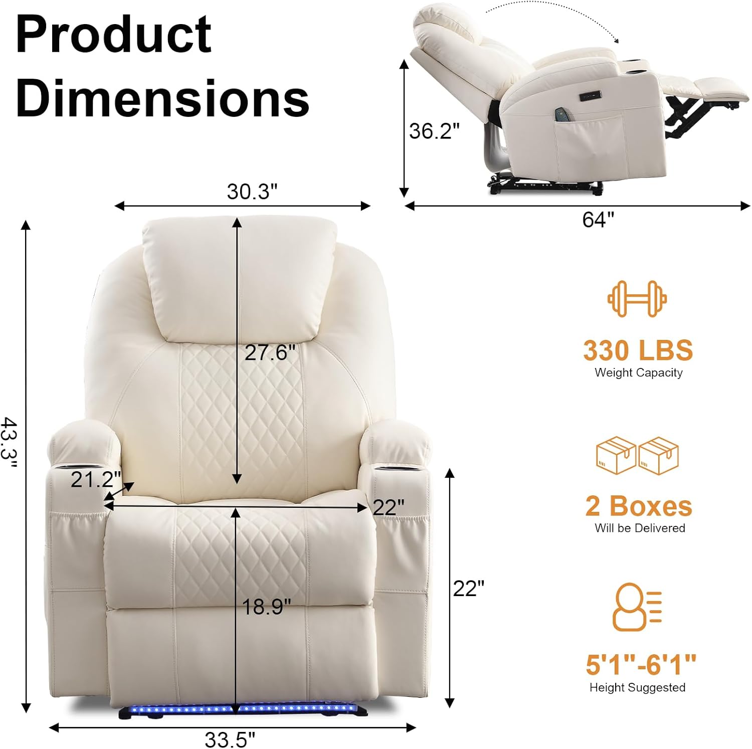 AHMED Power Recliner Chair with Vibration Massage & Heat for Adults, Faux Leather Home Theater Seating with Cup Holders/LED Lights/USB Ports/Side Pockets for Living Room, Beige
