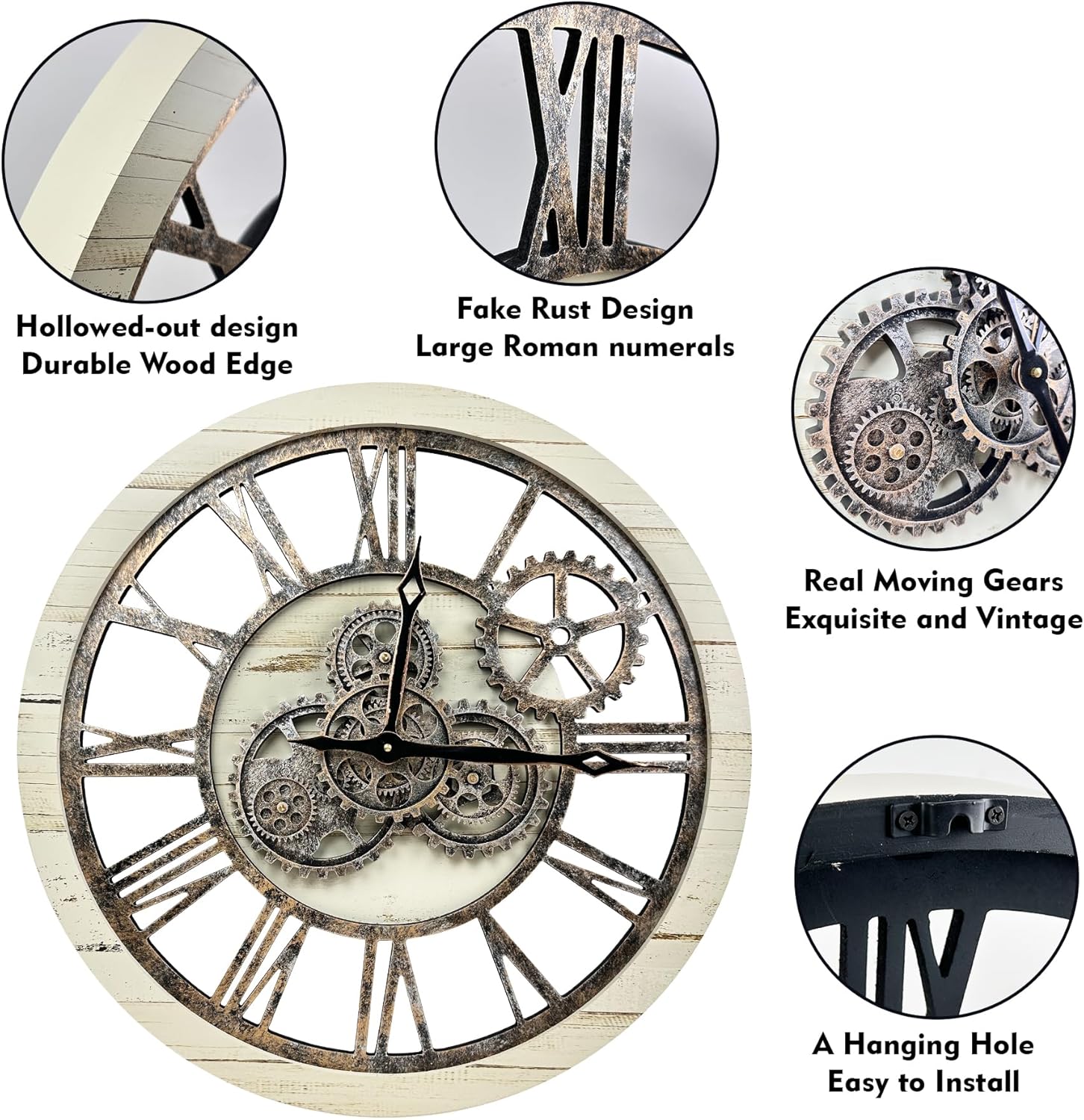 - REAL MOVING GEARS: Large wall clock with unique moving parts is as attractive as it is functional. Put batteries in, various gears start rotating fluently. Moving gear wall clock is amazing looking on the wall and will get so many compliments on it. Made from solid wood and painted by Rust-like color on wall clock create a very rustic and industrial atmosphere. Farmhouse wall clock is professionally handmade and pursuit of naturalness, so it may have some little imperfections.