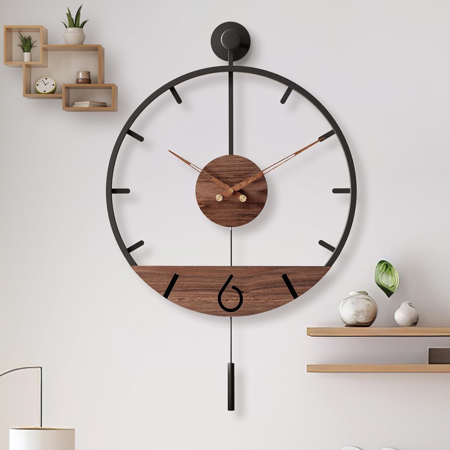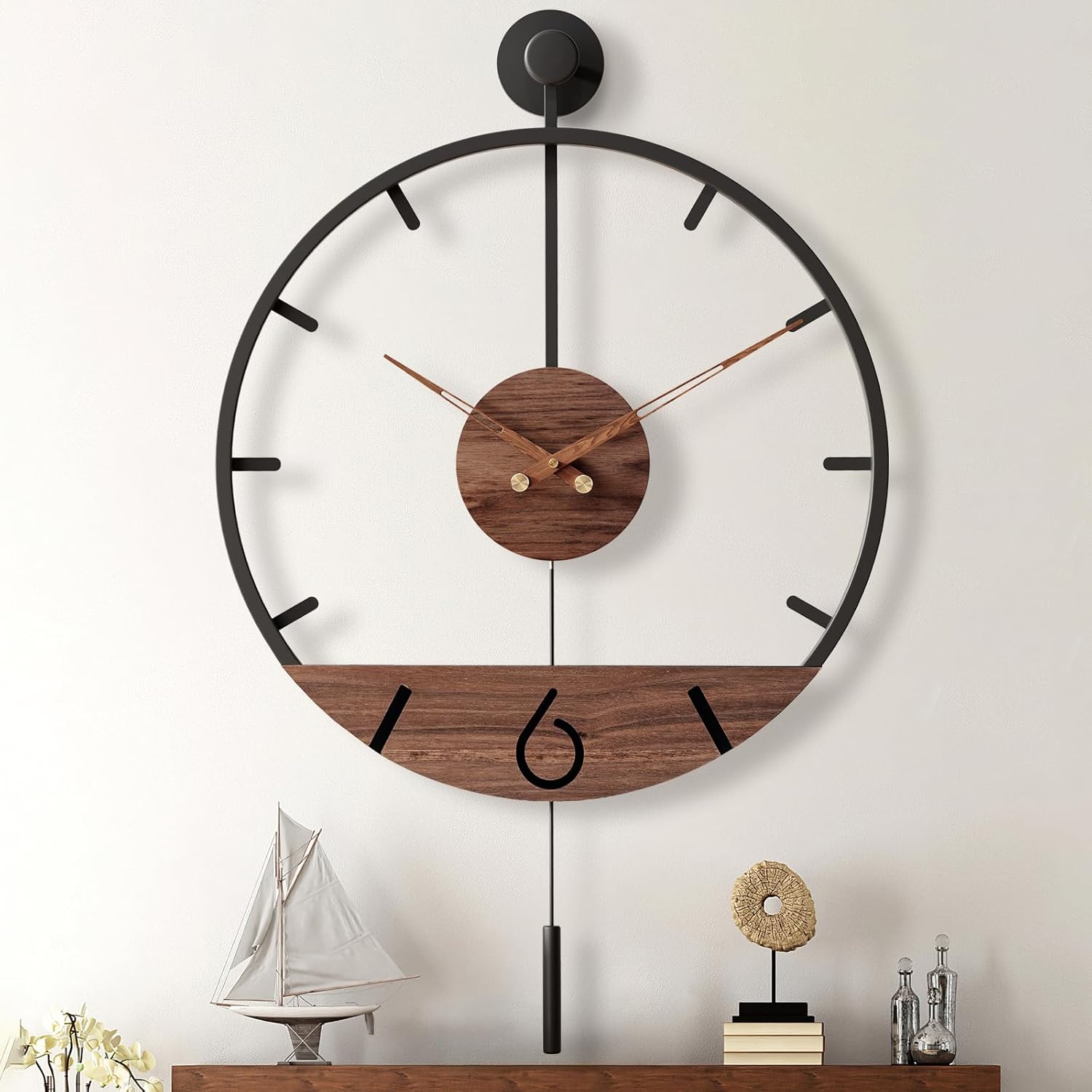 - 【Minimalist Modern Aesthetic Design】The Arabic numerals and minimalist metal accents act as hour indicators,contributing both practicality and a visually appealing touch.Our large modern decorative pendulum wall clock use sleek lines allow it to fit effortlessly into various interior styles,from modern and contemporary to classic settings, blending into different decor themes.