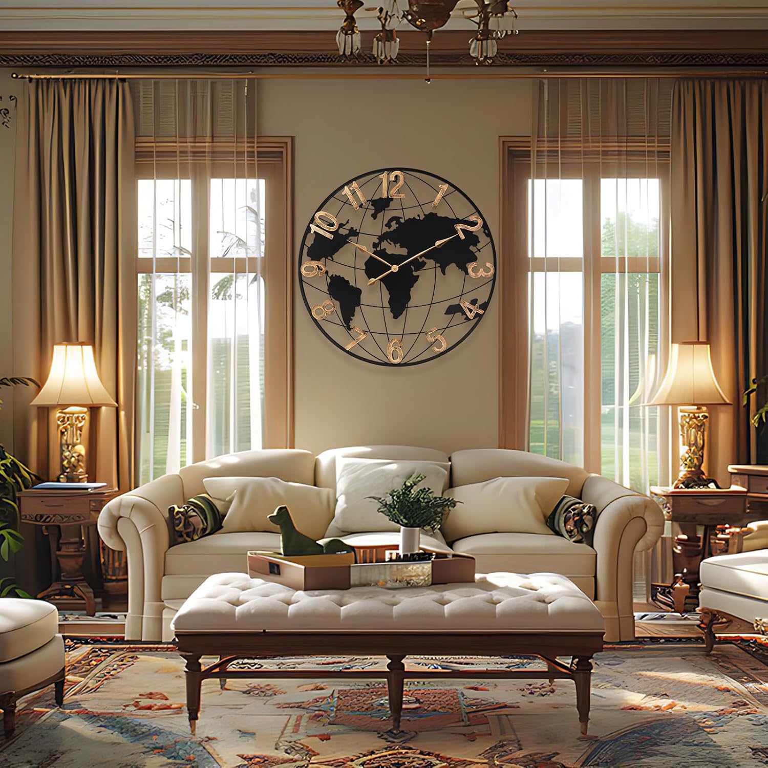 - 【Primary Focus of The Living Room】Pytha Sight 30 inch world maps wall clock is a stunning piece,sure to captivate your guests:It fits perfectly above fireplaces,and the vintage gold arabic numerals with classical vintage pointers help you read the numbers more:Our beautiful large wall clocks complements your living room decor,adding an elegant touch to your home;With its impressive large wall clock 36 inches or larger,this giant oversized wall clock is a perfect size for any room, and it has become a conversation starter whenever guests visit.
