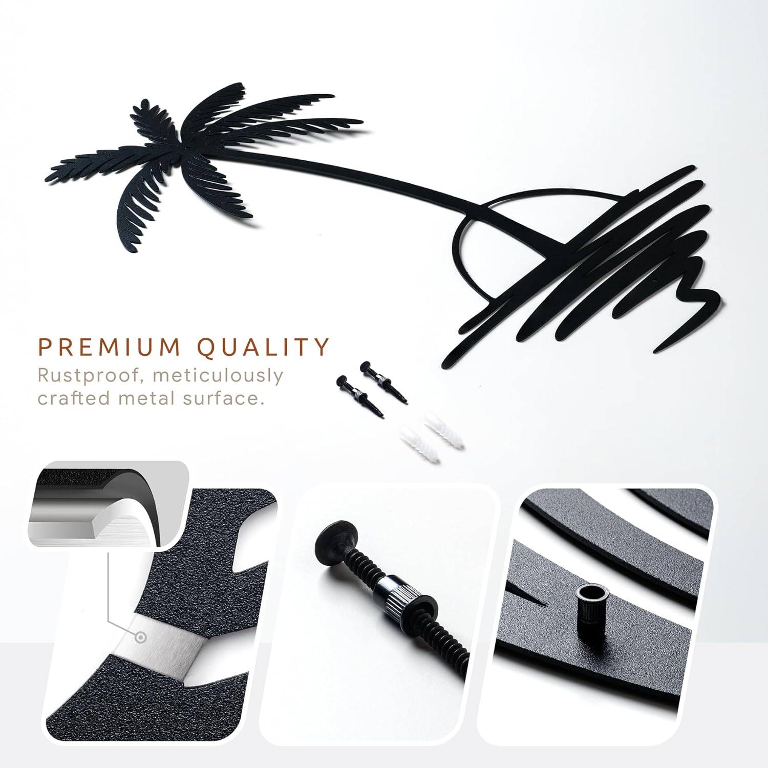 - HIGH-QUALITY METAL DESIGN WITH SUNSET PALM TREE: Expertly crafted from durable and long-lasting high-quality metal, this modern wall art showcases a captivating tropical scene with a sunset and palm tree. Perfect for enhancing the aesthetic appeal of both indoor and outdoor spaces, it adds a touch of exotic elegance and vibrant charm to your home decor. The intricate details and vivid colors of the sunset and palm tree create a relaxing and inviting atmosphere, making it an ideal addition to any living room, bedroom, garden, or patio.