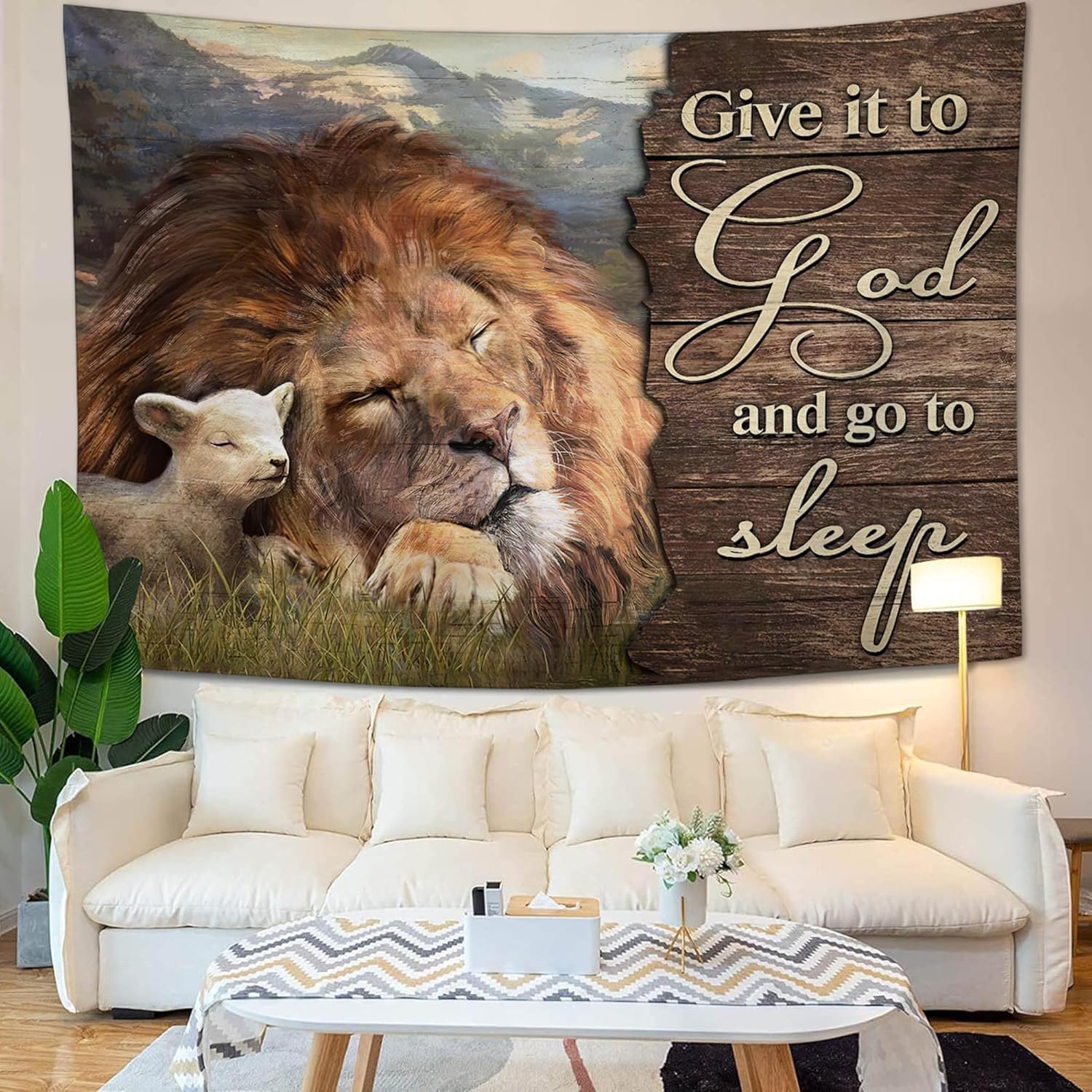 yowecso Lion and Lamb Tapestry Give It To God And Go To Sleep Tapestry Wall Hanging for Bedroom Christian Religious Tapestries Aesthetic Wall Decor for Home Dorm Living Room 40"x60"