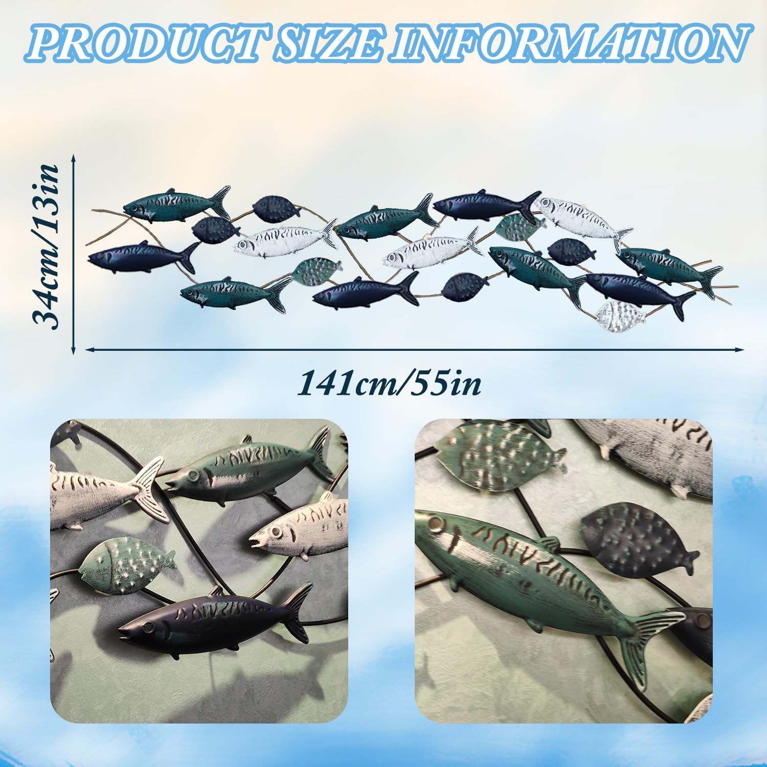 - Metal Fish Wall Décor : 19 lifelike fish frolicking in the water, handmade metal iron crafts, Hand painted old-fashioned fish decoration with a Mediterranean-style marine theme, Smart and elegant, lifelike, retro distressed finish. Large Size 55" x 13"(141 x 34cm).