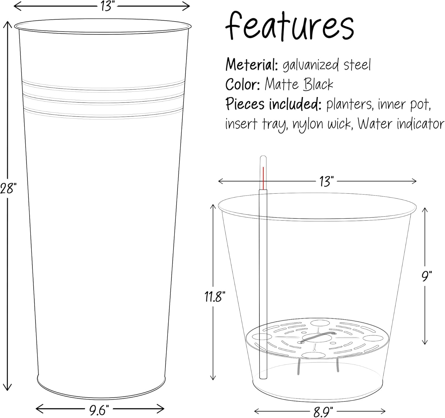 KOL 28'' Tall Galvanized Steel Planter Pot - Flower Pot with Water Level Indicator for Plants - 2-Pack Self Watering Planters - Round Black Powder Metal Planter Box - Indoor Outdoor Grande Plant