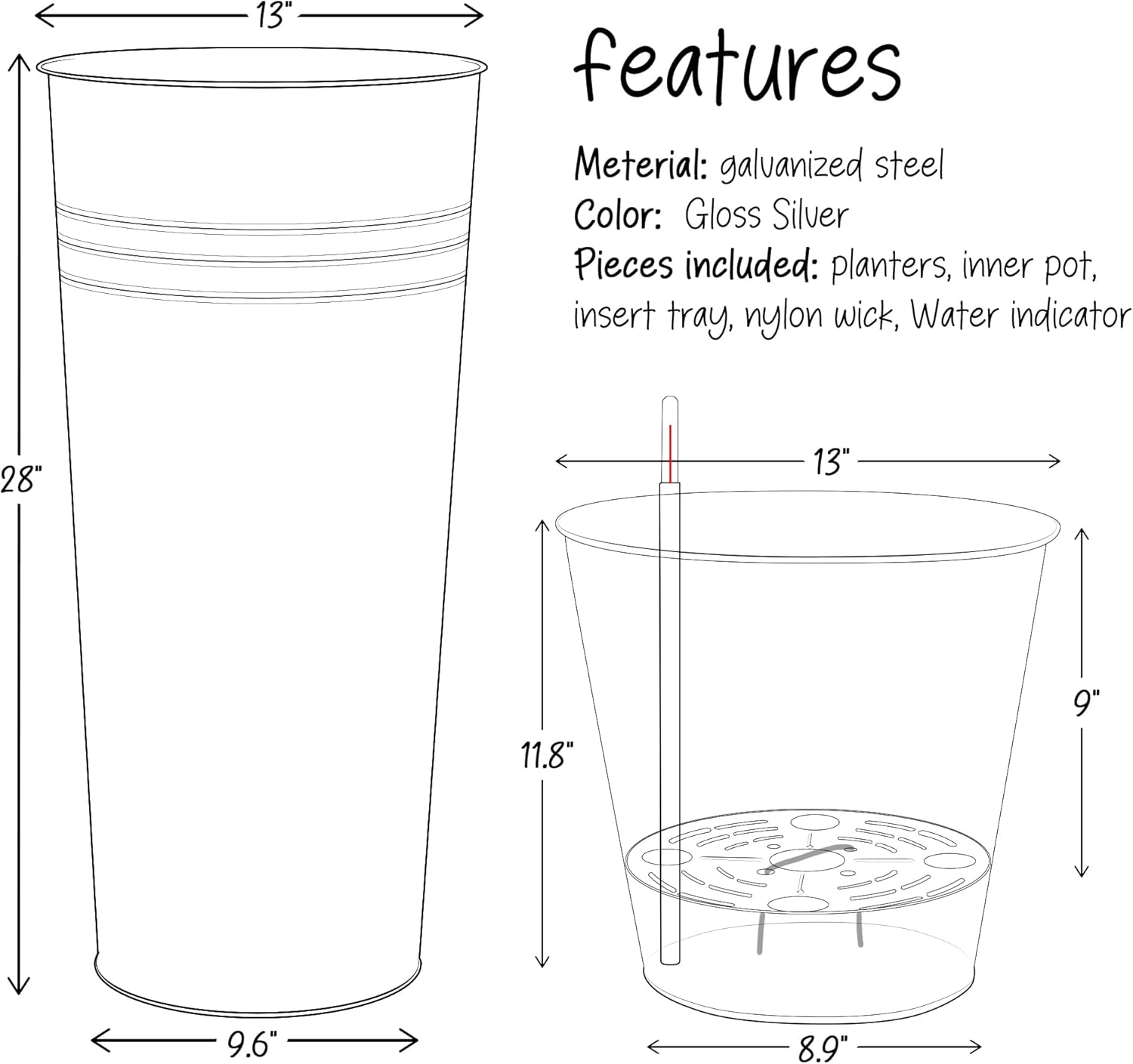 KOL 28'' Tall Galvanized Steel Planter Pot - Flower Pot with Water Level Indicator for Plants - 2-Pack Self Watering Planters - Round Silver Powder Metal Planter Box - Indoor Outdoor Grande Plant