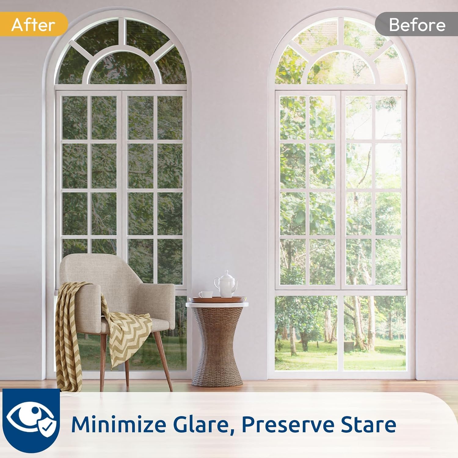 - UV Protection, Glare Reduction: Blocks up to 90% of UV rays, this window film heat blocking helps protect flooring, furniture, and draperies from fading. It also protects your eyes and skin from harmful UV rays. With 14% VLT, it effectively reduces glare while allowing some visible light in, creating a comfortable indoor environment