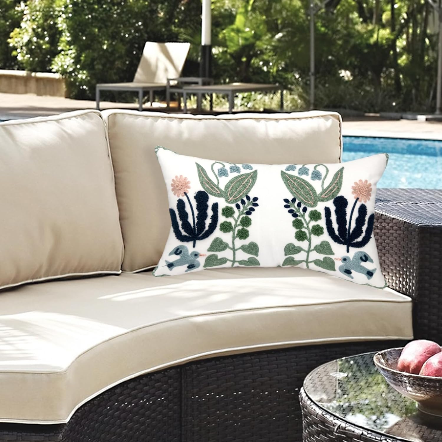 Alysheer Floral Embroidered Summer Lumbar Decorative Throw Pillow Cover 12"x 20", Farmhouse Cottage Navy Blue Green Flowers Leaves Patterned Cotton Canvas Cushion Case for Sofa Couch Bed Living Room