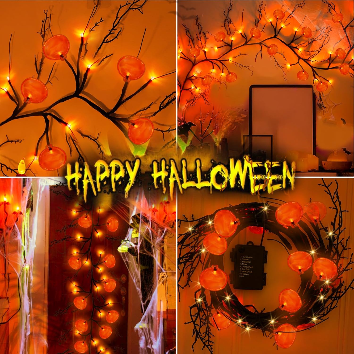 - đăHalloween Willow Vine Twig Lightsă 2025 newly upgraded large unique Halloween willow vine decor garland lights. Well-designed and handmade prelit artificial Twigs Halloween Decorations Garland is 6 Ft with total 54 spooky LED lights, including 18 orange Jack-O-lantern steric pumpkin lights and 36 orange LED, embellished on the 18 big twigs and 54 small twigs. Creating a spooky and scary atmosphere