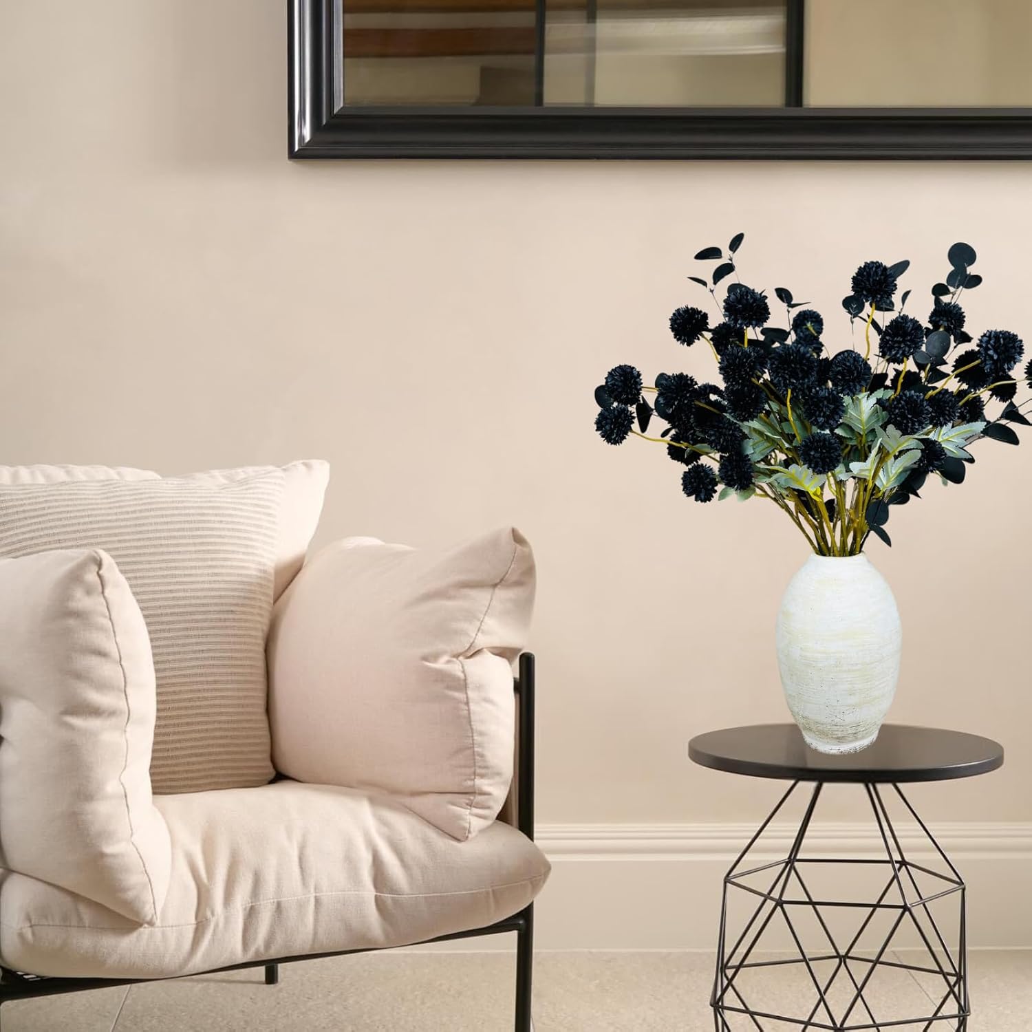 - Elegant halloween faux flowers : Enhance your home decor with our stunning faux black flowers. These silk mum balls and black eucalyptus stems provide a chic, gothic touch to any centerpiece, making them perfect for Halloween, fall, or boho-themed decorations. With 10 long stems which include 50 small mum balls, you'll have plenty to create an impressive black floral arrangement. Ideal for indoor use, these artificial flowers bring a touch of gothic and black decor to your living space.