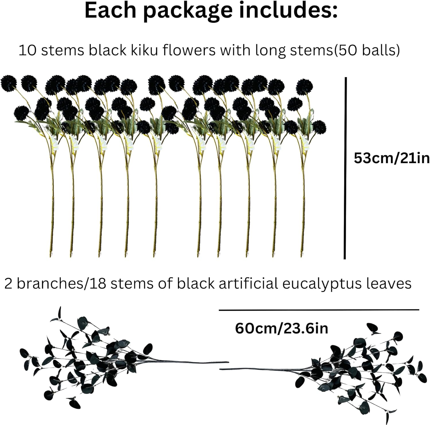 - Perfect for Halloween Decor : Create a spooky and dark moody decor with our black fake flower arrangement. Perfect as Halloween flower for haunted house decor, these black floral bouquets are designed to impress. The black foliage from black eucalyptus stems and long stem fake black flowers add an eerie elegance to your home, making them an excellent choice for Halloween floral decor. Pair them with our Kiku flower orange to complete the black and orange look.