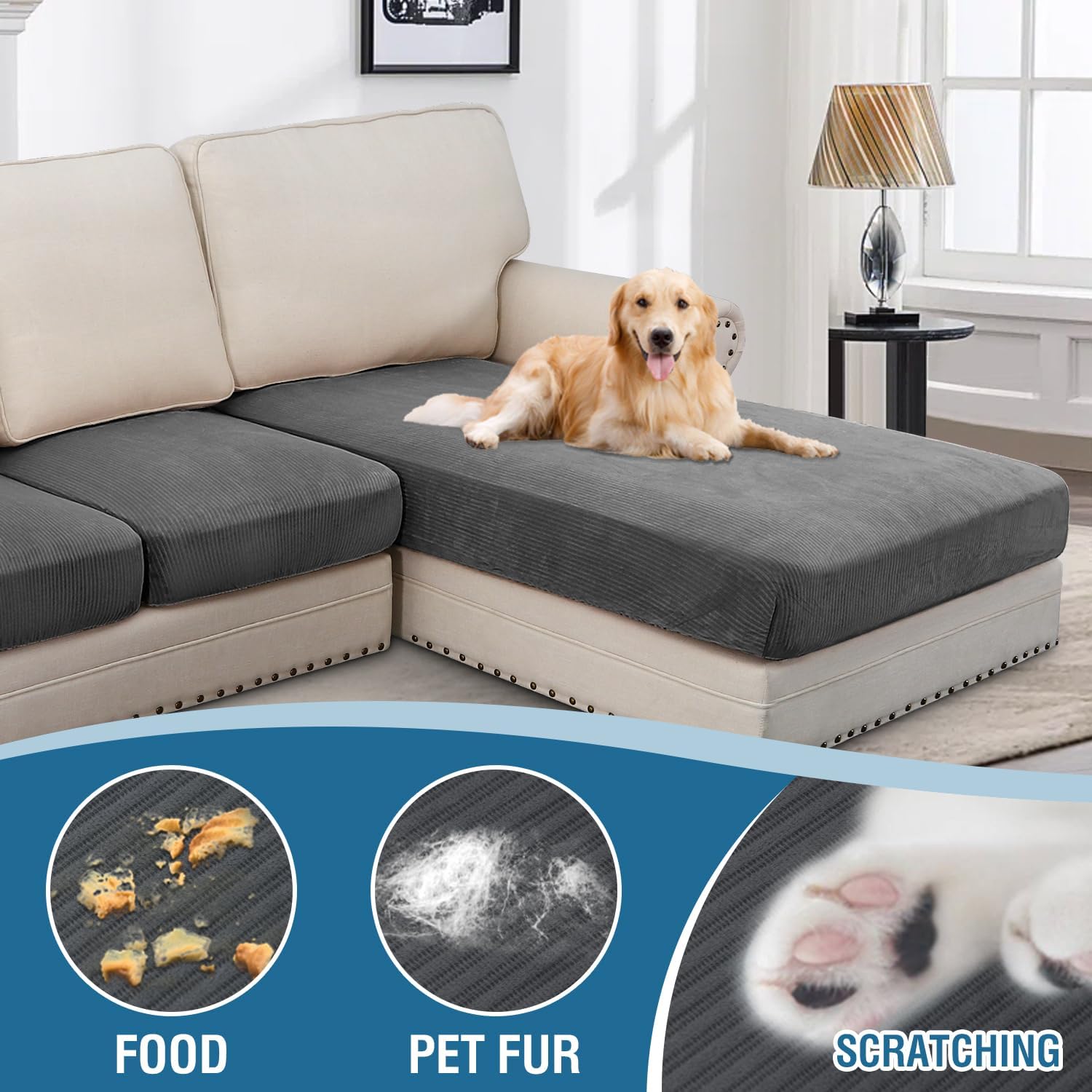 - INCREDIBLY COMFORTABLE VELVET: Products passed GLOBAL RECYCLED STANDARD certificate.This innovated stretch sofa slipcovers are constructed with 4 PIECES,including 1 Chaise cover and 3 individual cushion covers. Crafted from luxurious velvet plush fabric with unique striped cuts, feature thick, soft, smooth, anti-wrinkle, no fading, durable as well as highly stretch. Protect your cushion furniture from daily wears and tears, stains, kids, scratches from pet claws, dogs or accidental spills