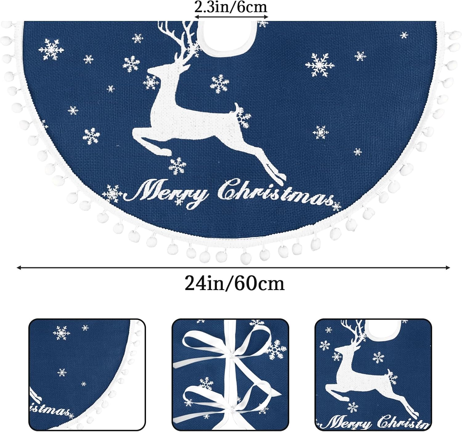 24 Inch Christmas Tree Skirt, Burlap Blue Christmas Rustic Tree Skirt with Elk Deer and White Snowflake Printed for Holiday Party Xmas Tree Decoration