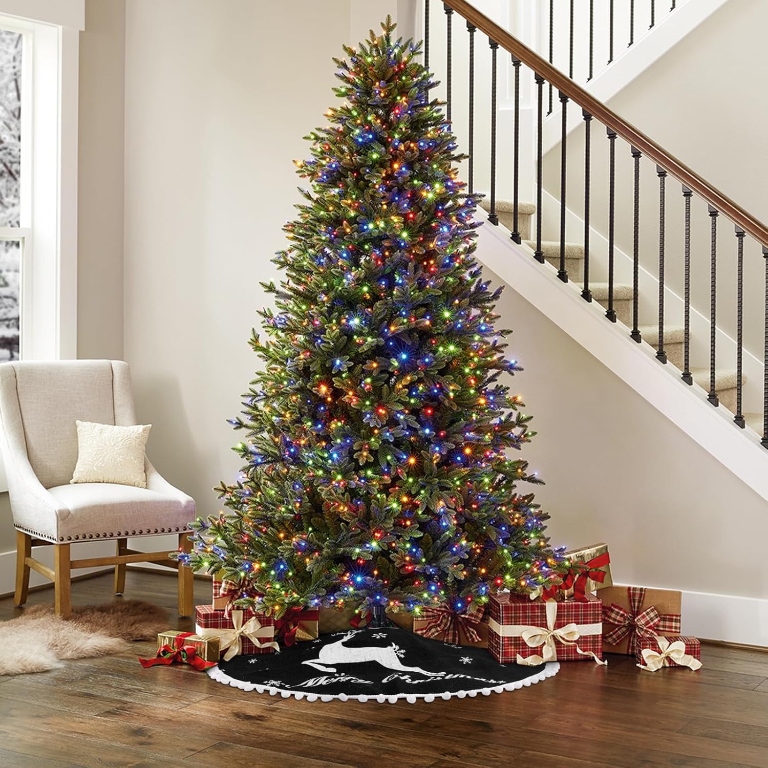 - Merry Christmas Tree Skirt:Our Christmas tree skirts is printed with elk and various sizes of snow patterns, as well as the words "Merry Christmas." The edges are adorned with small, fluffy balls, adding a festive touch to your Christmas tree. This 36-inch tree skirt is perfectly sized for most Christmas trees perfectly. Before making a purchase, please measure the diameter of your tree to ensure a perfect fit