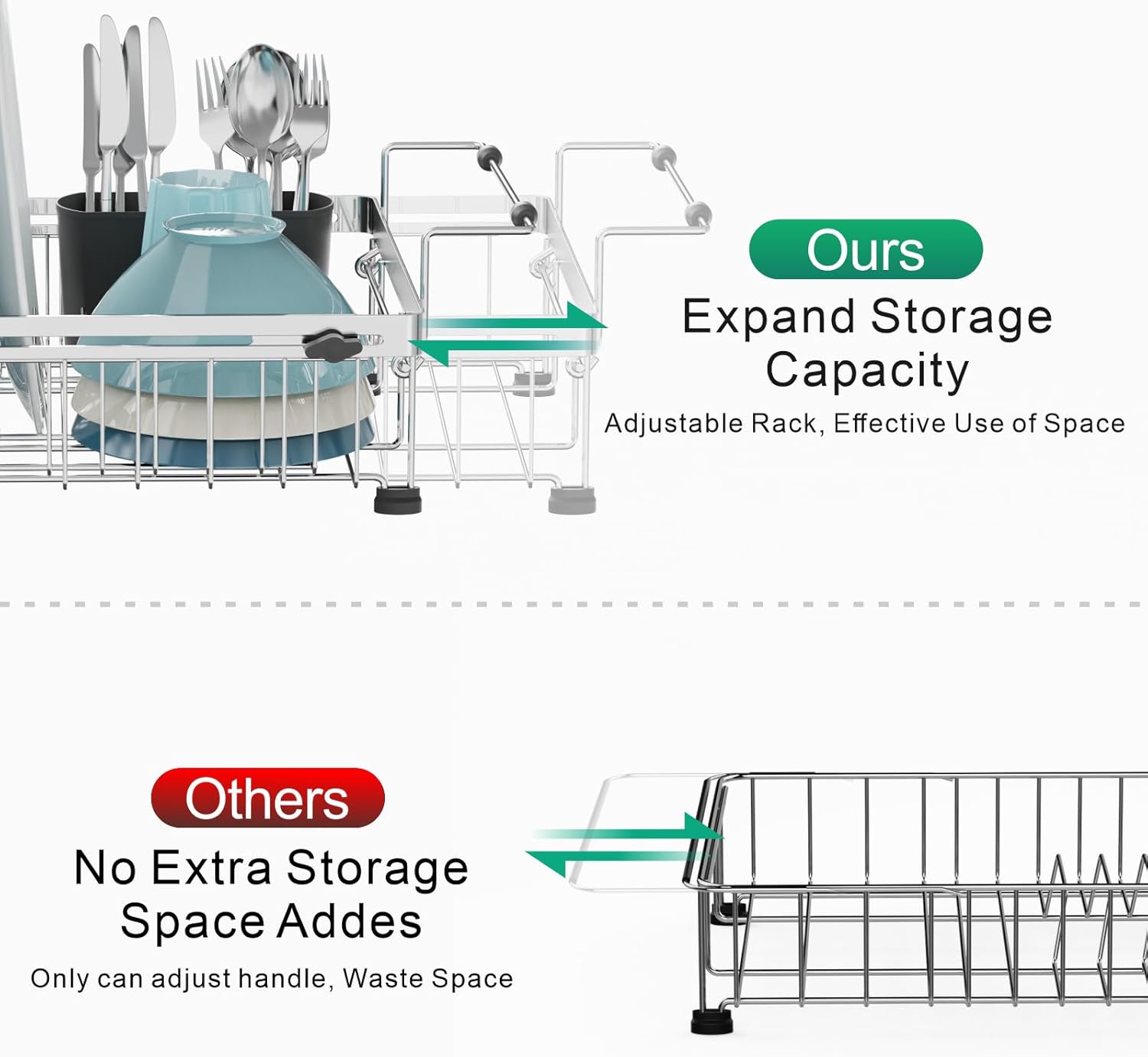 - True Expandable, Real Capacity Boost: Unlike other racks that only extend handles, our dish drainer expands as a whole unitâtruly increasing your drying space, allowing you to comfortably hold at least 3 extra cups in addition to 8 plates, bowls, utensils, and even fresh fruits and veggies. This innovative design not only ensures perfect sink compatibility but genuinely maximizes your drying area.