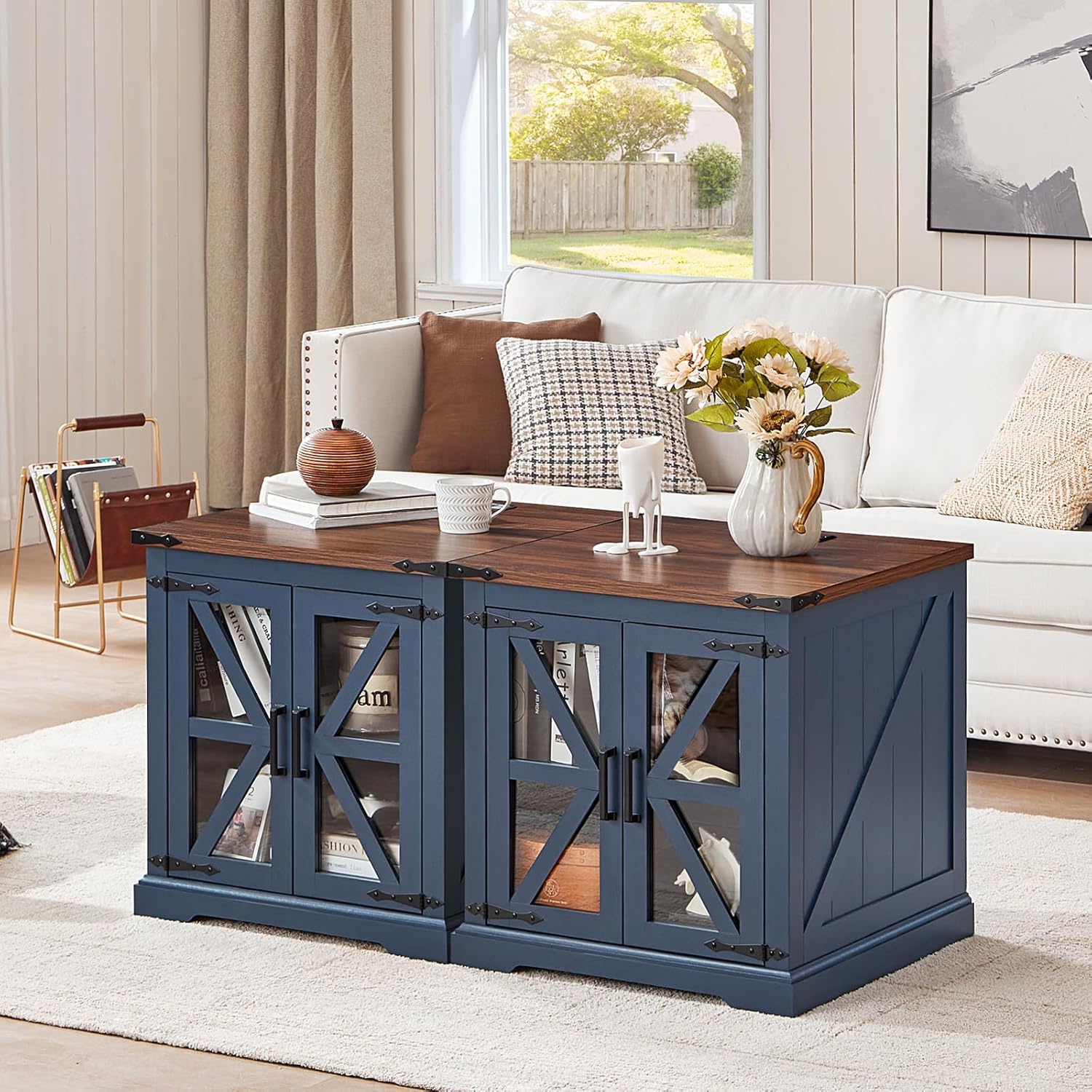 - π‘[Functional Art Piece]The oversized end tables living room storage design provides convenient storage for your living space. The built-in shelves can be adjusted to 3 different heights as per your needs, accommodating an abundance of books, blankets, or coffee mugs. The glass barn-style doors blend traditional farmhouse aesthetics with a modern sensibility, transforming this piece into a more contemporary farmhouse night stand, coffee table, bedside table, or side-of-sofa art.