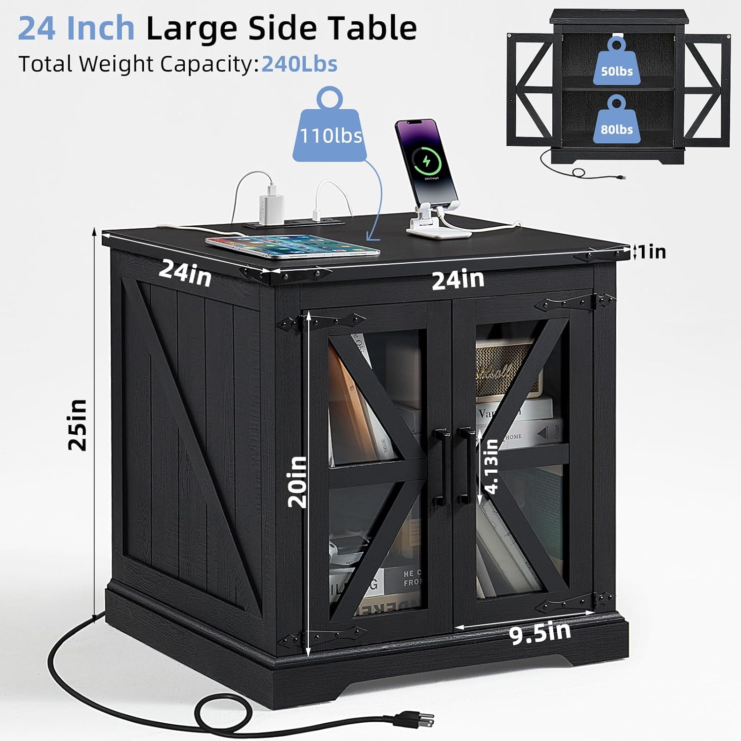 - π‘[Farmhouse-Style end Table with Charging Station]This large end tables with generous storage is a perfect fusion of farmhouse and industrial metal styles. The exquisite barn-style tempered glass doors and the black metal corner accents add an elegant touch to the cabinet body, making it visually captivating from any angle.