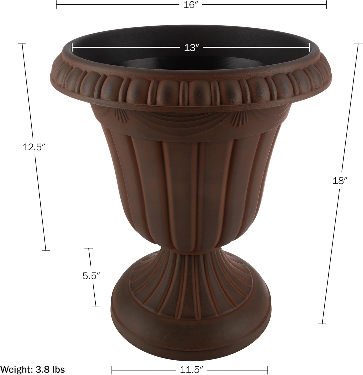 - PRODUCT DETAILS - Materials: Recycled Polypropylene Plastic. Dimensions: (L) 16β x (W) 16β x (H) 18β; Weight: 3.8lbs; Interior Planting Space: 13β Diameter x (H) 12.75β; Soil Capacity: 30lbs/13.6L. Front Door Planters Outdoor Set of 2. Color: Brown.