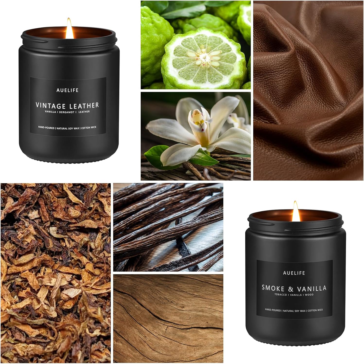 2 Pack Men Candles | Smoke & Vanilla + Vintage Leather - Scented Candles for Men - Masculines Candle - Soy Candle for Home Scented, Man Gifts, Black Jar - 7oz