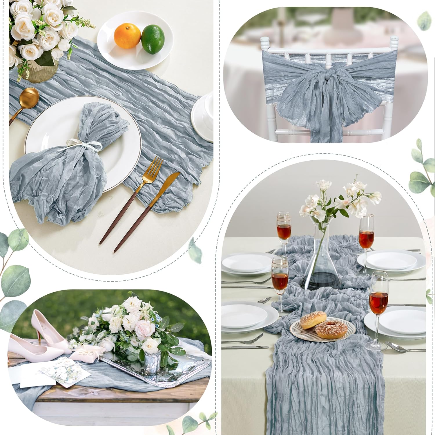 - PACKAGE INCLUDED: You will receive 6 pieces of dusty blue cheesecloth table runners. Elegant and beautiful design, exquisite workmanship. Product size: Each boho table runner is 35 x 120 inches. Enough to cover rectangles and round tables, as well as long tables that are stitched together. It can even be used to belt chairs decorate napkins, background curtains. Round or square tables for 8-10 people, perfect for romantic and elegant party events