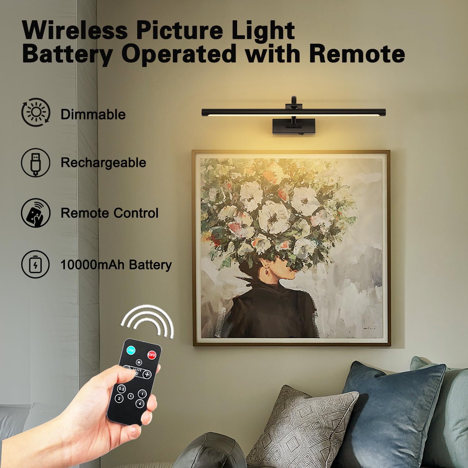 - Dimmable And Timer Function: The battery picture lights is 10-100% dimmable and of timer function with the remote control. The art light can automatically turn off in 0.5-4 hours.