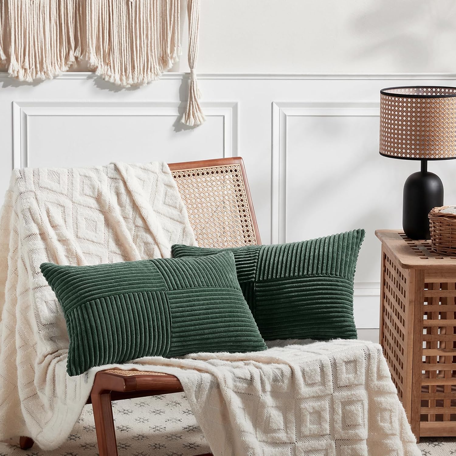 Fancy Homi Set of 2 Dark Green Long Lumbar Decorative Throw Pillow Covers 16x24 Inch for Living Room Couch Bed, Boho Farmhouse Forest Green Home Decor, Soft Corduroy Corss Textured Cushion Case