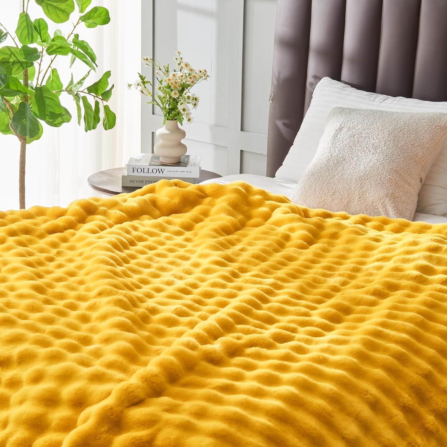 NEWCOSPLAY Faux Fur Throw Blanket Mustard Yellow Bubble Blanket Thick Warm Soft for Couch Sofa Bed 550GSM (Mustard Yellow, Throw(50"x60"))