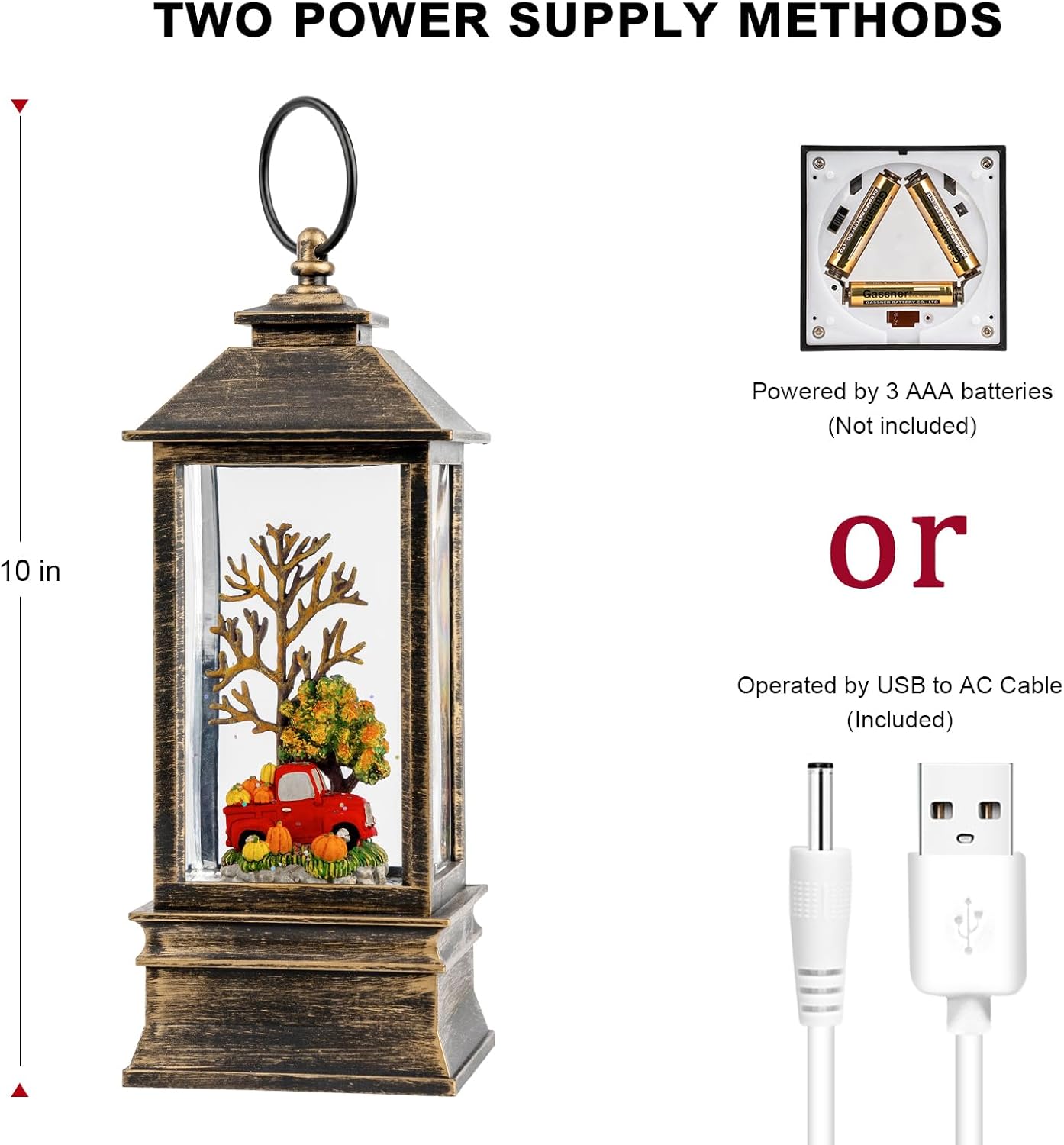 - đăCelebrate Fall Harvest DayăHarvest scene with a red pickup truck hauling pumpkins lighted Water Lantern Snow globe for the harvest! The Swirling glittering flakes begin to fall from the tree trunk when switching on, impress your guests.