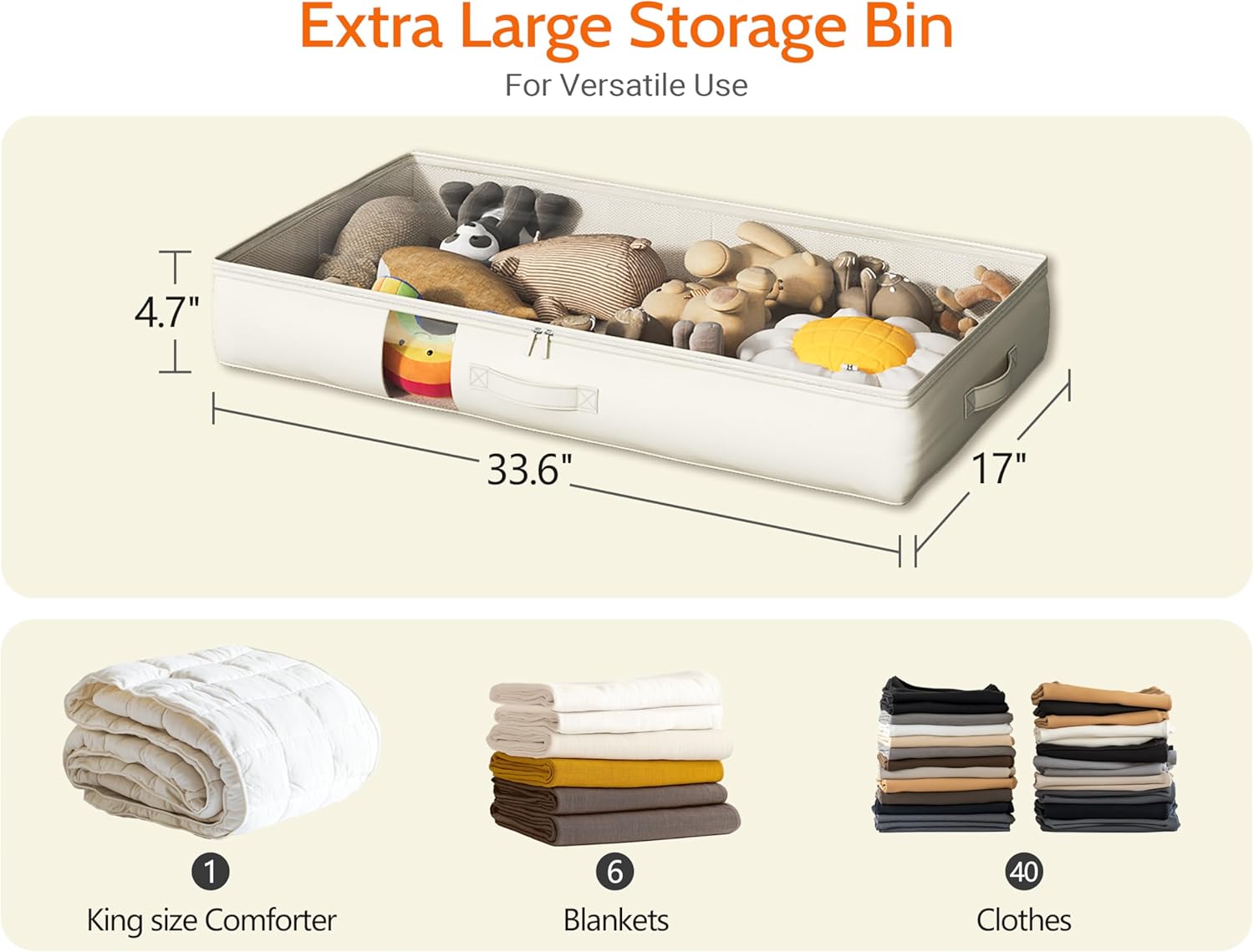 Soft-Sided Foldable Under bed Storage Bags with Window,No Rigid Frame Closet Organizers,Storage Containers for Blankets, Clothing, Comforter, Collapsible Fabric Design,4 Pack, White Ivory