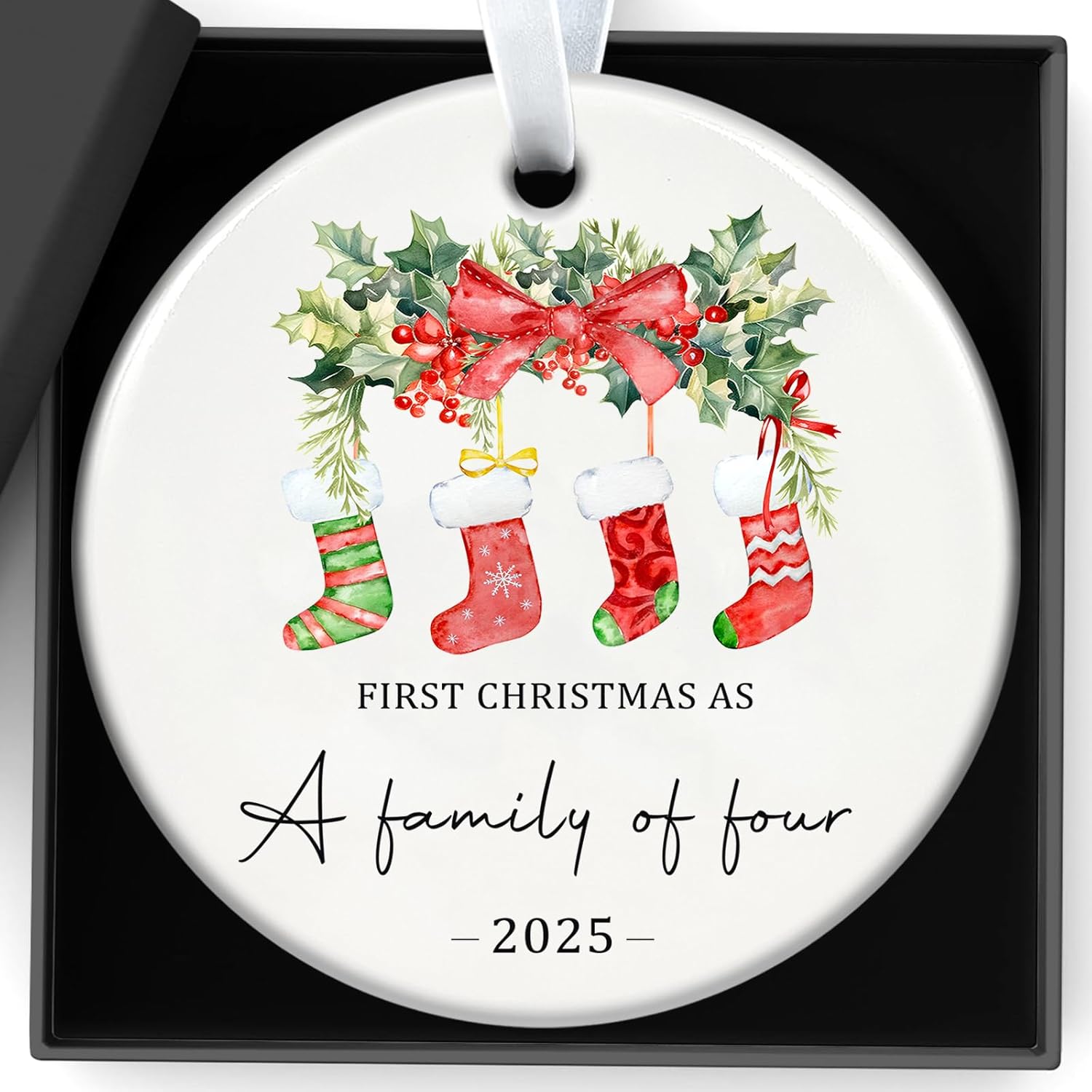- 【Family of 4 Christmas Ornament 2025】Celebrate your first Christmas as a family of four with our beautifully crafted family of four Christmas ornament. This personalized ornament features the words "First Christmas As a Family Of Four 2025" along with a heartwarming design of a family house and squirrels together surrounded with Christmas garland and stocking, symbolizing love and joy for your growing family.