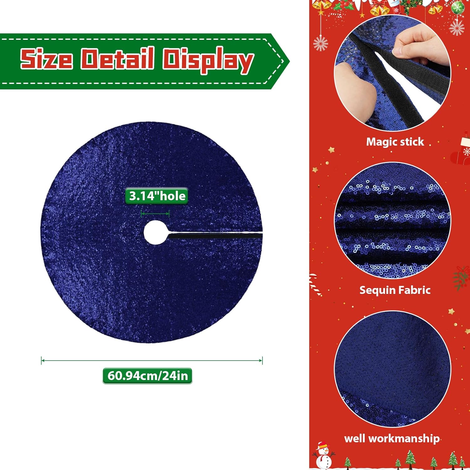 - 【Sequin Material-Not See Through】: The sequin tree skirts are thick and dense 3MM round high-density material sequins with satin fabric backing.Tree Skirt Serged edges with hook and loop fasteners avoid falling sequins