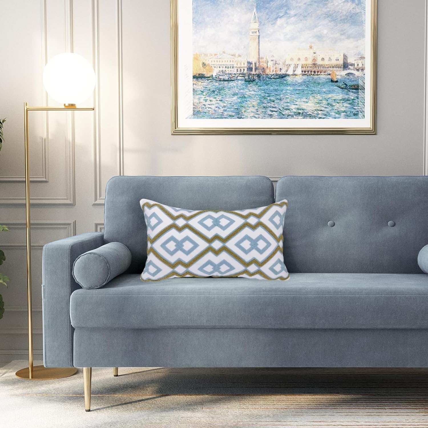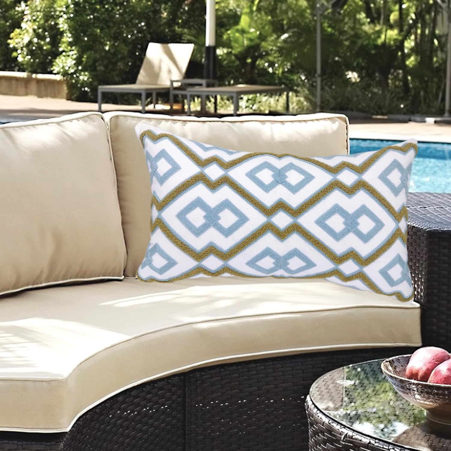 Alysheer Embroidered Lumbar Decorative Throw Pillow Cover 12"x 20", Classic Boho Geometric Embroidery Pattern Cotton Rectangular Cushion Case for Sofa Couch Living Room Bedroom (Blue Khaki)