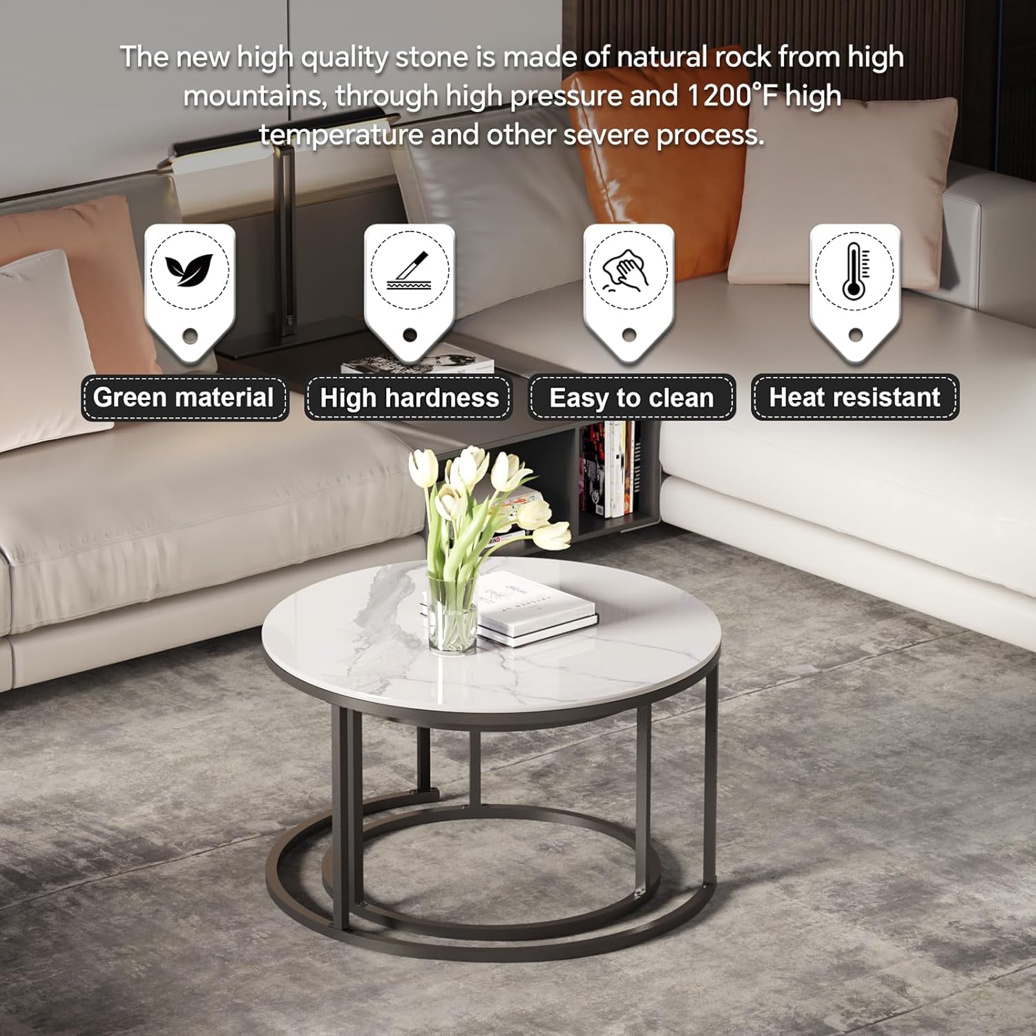 Round Nesting White Modern Decorative Coffee Table (Set of 2), Sintered Stone Top & Sturdy Metal Frame for Living Room