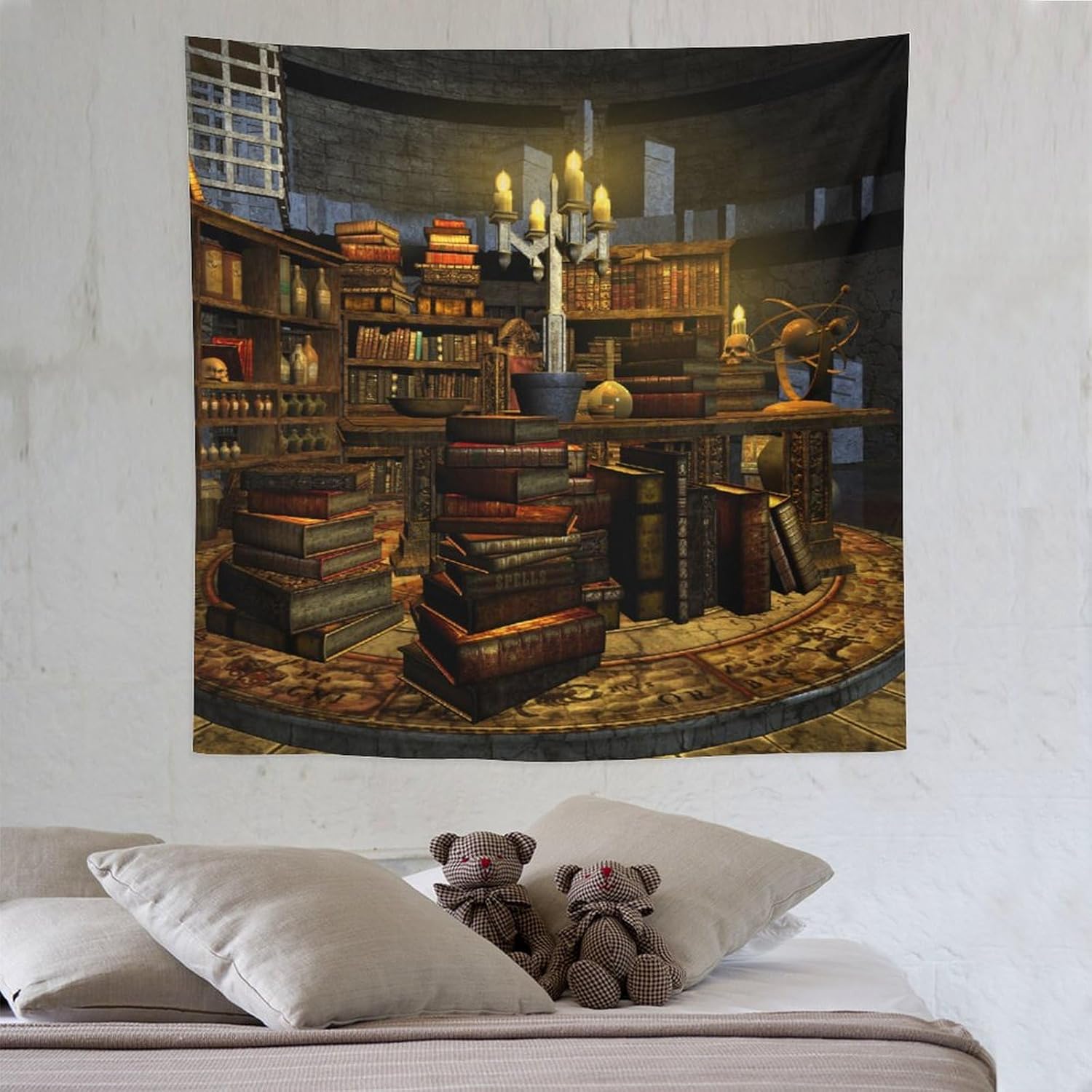 Kurtect Library Tapestry,Vintage Medieval Bookshelf Wooden Bookcase Antique Magic Art Tapestries for Party Beach Picnic Blankets Tablecloths Living Room Wall Deocr, 60x60 in