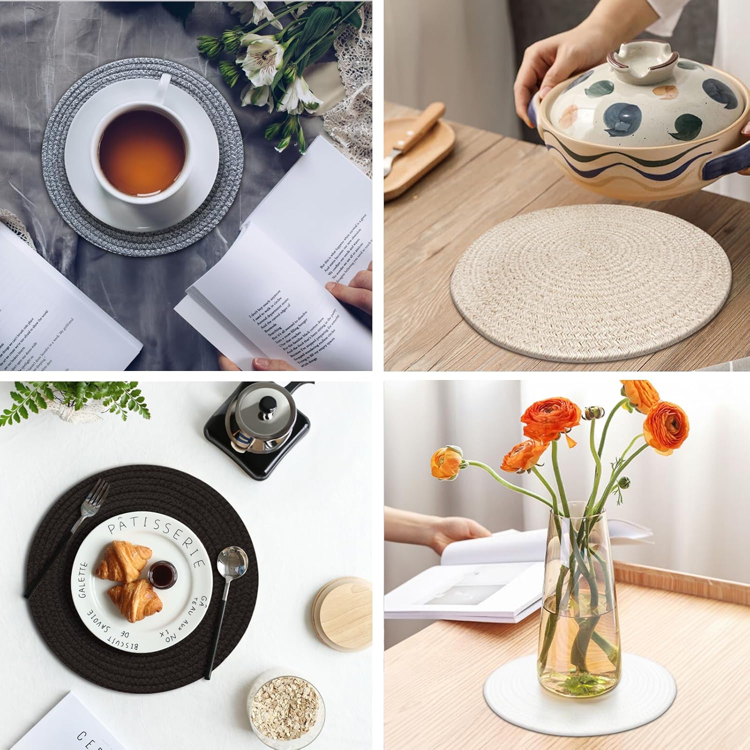 - Uses: These mats can not only be used as platemats, coasters, trivets, but also can be used as kitchen hot pads, can be placed in vases and flower pots. They are protective and decorative mats for table.