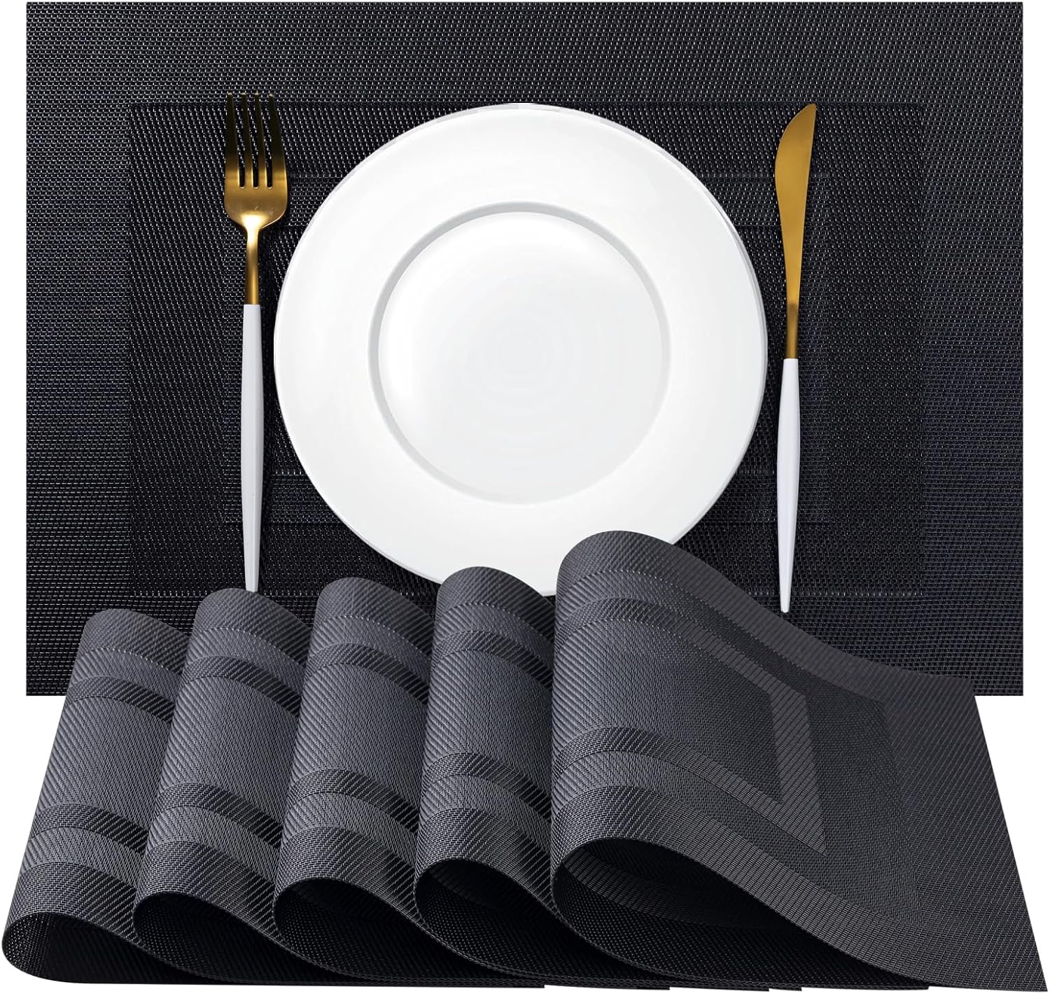 Placemats Set of 8 - Easy Clean Woven Vinyl Placemats for Dining Table, Indoor/Outdoor Place Mats, Washable PVC Table Mats(Black Cube)