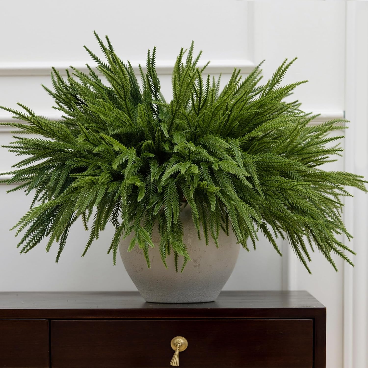 - 【Premium Quality and Natural Appearance】Crafted from high-quality PE, these branches mimic the natural green color of real Norfolk Pine, offering both aesthetic beauty and durability. After opening the package, simply let the product air out for a few hours to eliminate any initial odor, ensuring a better experience. Note: Vase not included.
