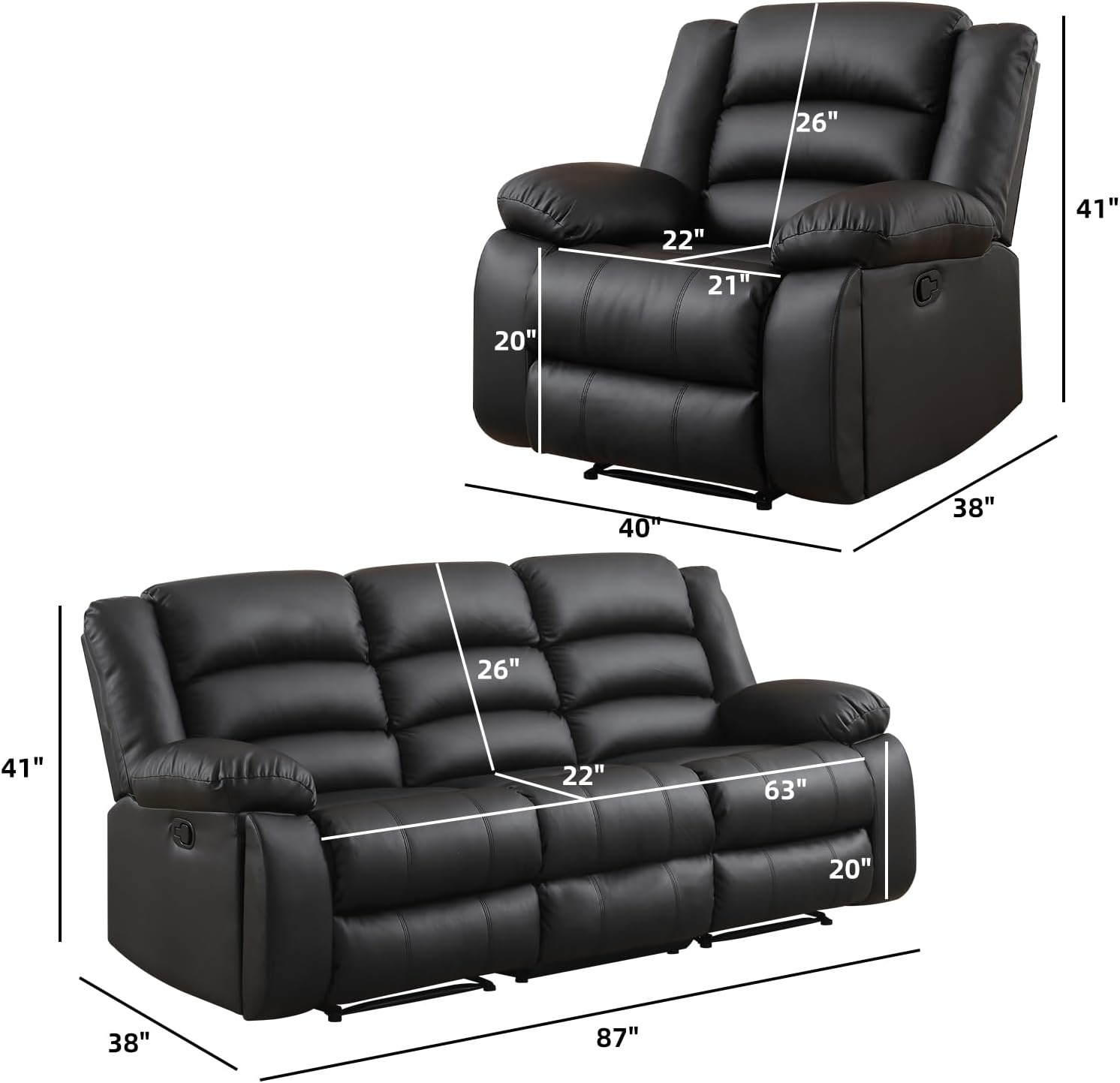 EBELLO Faux Leather Manual Recliner Sofa Set, 3 Seat Reclining Sofa, Couch Furniture Set for Living Room, Black