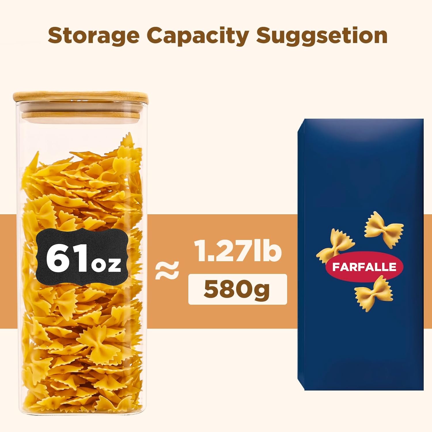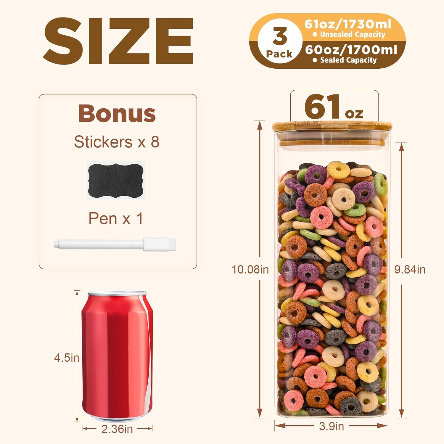 - [Product details] Square glass storage jar height:10.08in. Diameter:3.9in. Capacity:610oz(1730ml). Package contains: 3pcs. 3 pieces glass pantry storage containers with same volume meet you various storage need.