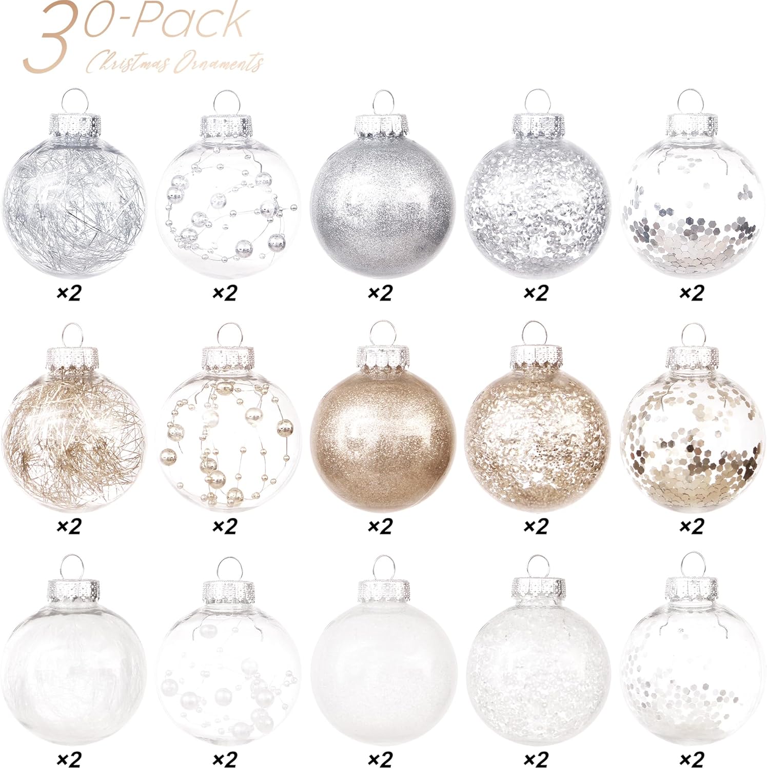 Sea Team 60mm/2.36" Shatterproof Clear Plastic Christmas Tree Ball Ornaments Set, Decorative Hanging Transparent Xmas Baubles with Stuffed Delicate Decorations (30 Counts, Champagne, Silver, White)