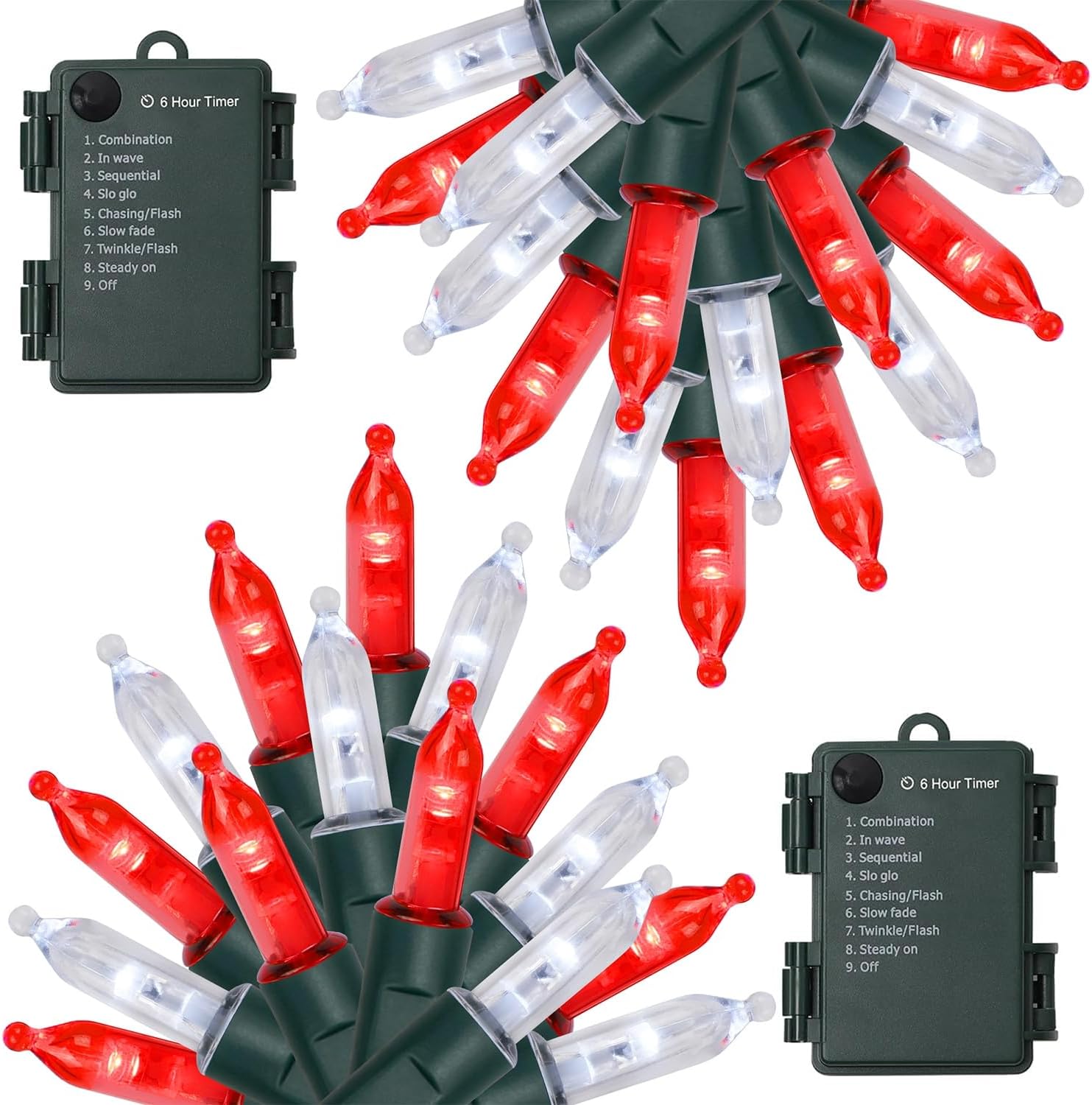 WATERGLIDE 2 Pack 50 LED Outdoor Christmas Lights, 16FT Battery Operated Mini String Lights with 8 Modes & Timer, Xmas Tree Lights Waterproof for Patio Garden Party Wedding Holiday Decor, Red & White