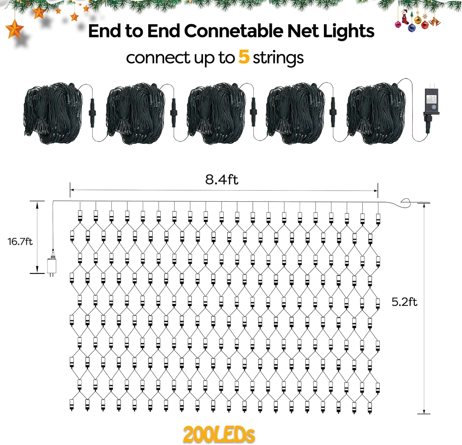 - End to End Connectable Design: Each set of our Xmas net lights come with male and female connector, allowing them to be connected in series with each other. It supports up to 5 strands be connected, totally 1000 LEDs, achieving the ability to control multiple net lights with only one electrical socket. Attention: If connected more than 5 strands, it will cause the brightness to gradually decrease.