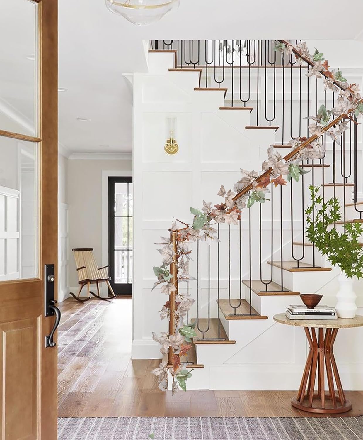 - 【Realistic Fall Leaves Garland】The colors of the maple leaves range from light green to vibrant orange, look like the real fallen leaves, making for a great blend of colors to warm up any room. Perfect festival decorations for indoor or outdoor.