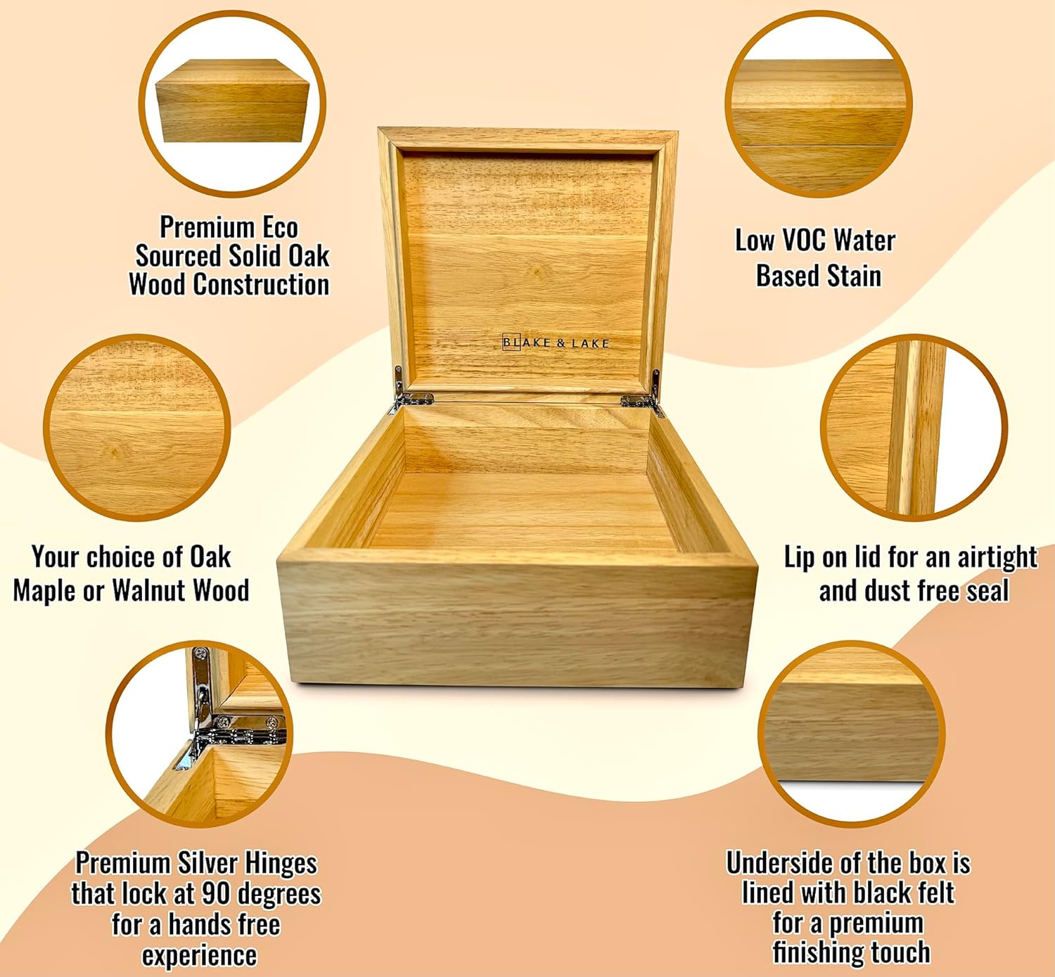 Blake & Lake Wooden Eco Box with Hinged Lid - Solid Oak Wood Storage Box with Lid - Wooden Keepsake Box - Decorative wooden boxes with lids for Keepsakes (Oak)